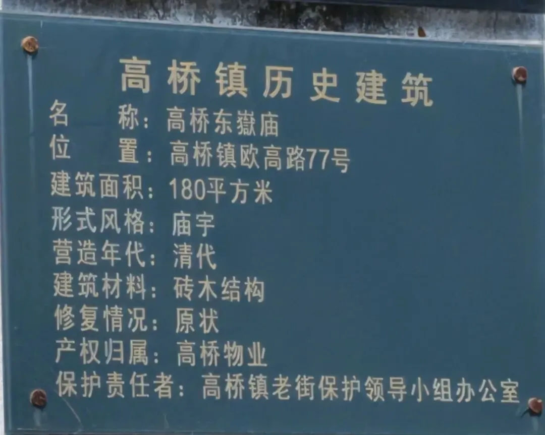 站在欧高路上,抬头可见东岳庙的青灰瓦顶,与周围的现代建筑形成鲜明对比。它不再是香火缭绕的宗教场所,却成为历史的活化石,见证着高桥从渔村商镇到现代城区的变迁。那些关于庙会、祭祀与乡土的记忆,如同庙墙上的铭牌,虽被时光磨旧,却始终清晰地镌刻在这片土地上。