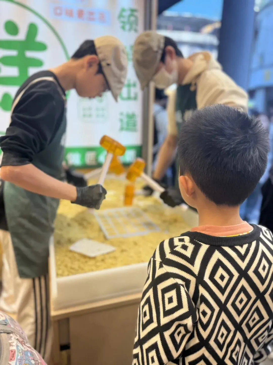 儿子看得入了迷,专注地看着师傅用锤子敲打绿豆饼,眼里满是对家乡味道的好奇。我想,这就是传承吧,不管城市怎么变,这些味道和手艺,总会一代一代传下去。