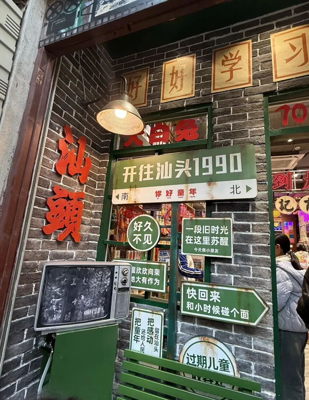 青砖墙、旧电视、复古路牌,把人瞬间拉回80年代的汕头街头。“好久不见”“快回来和小时候碰个面”,这些标语戳中了我们这些“过期儿童”的泪点。原来,我们怀念的不只是童年,更是那个不慌不忙的自己。