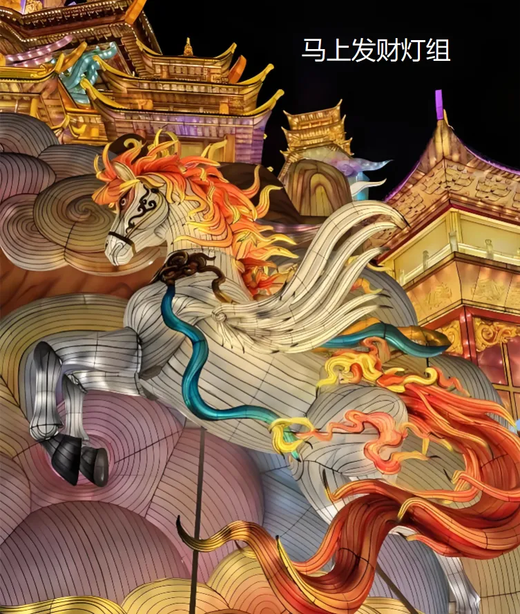 3.《马上发财灯组》:数十万颗灯片手工粘贴,柔和的灯光线条如广沃草源上的烈马奔腾、欲跃而起,这是只有自贡老师傅才掌握的“温润光感”秘技