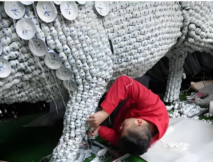 1.《青花瓷龙》:耗时9000工时,用12万件青花瓷器捆扎而成。走近看,每一片都是完整的碗、盘、勺