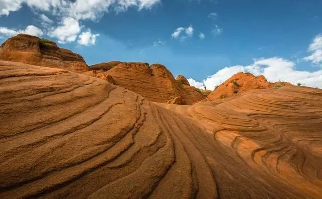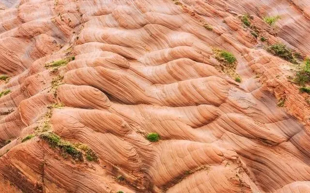 亿万年风化加流水侵蚀 , 地下岩石露出来 , 形成了一片火星地表一样的丹霞地貌。 岩石上层层叠叠的纹理 , 活像波浪在起伏 , 跟美国波浪谷特别像。 雨后天晴或者日出日落的时候去 , 红砂岩的颜色鲜艳到发光!