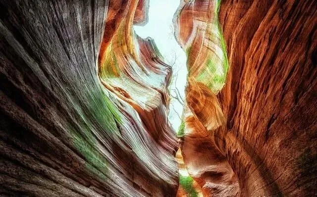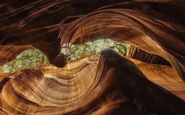 数百万年 , 风吹、水冲、时间磨 , 峡谷壁被打磨得光滑如绸 , 岩石表面一层层条纹 , 视觉冲击太强了。