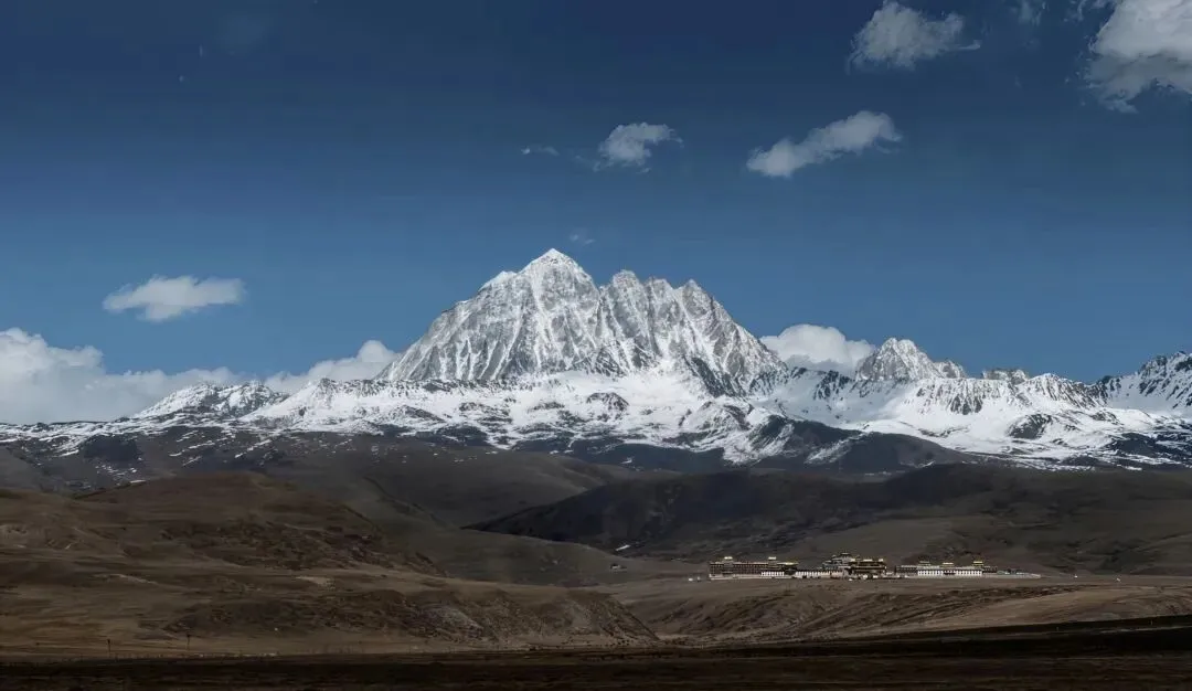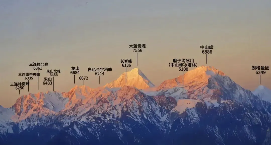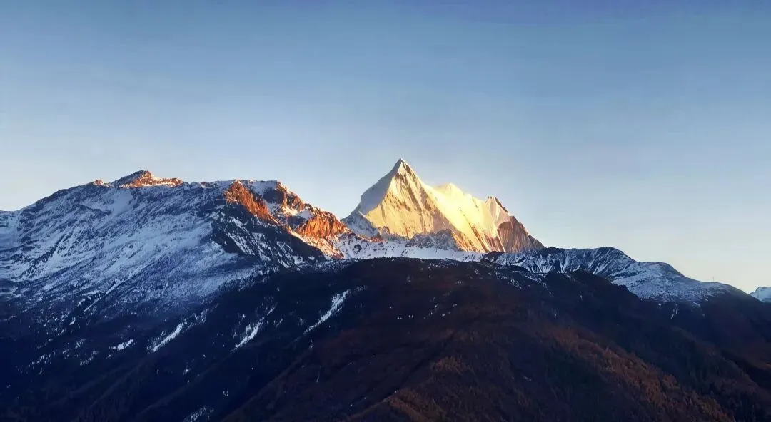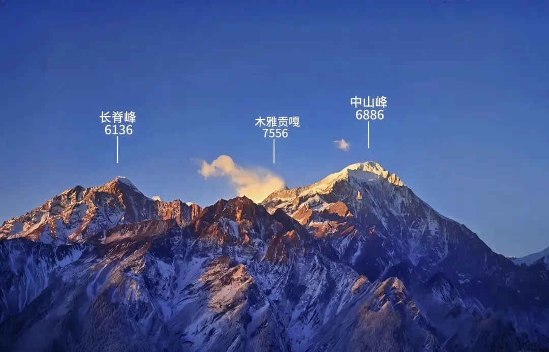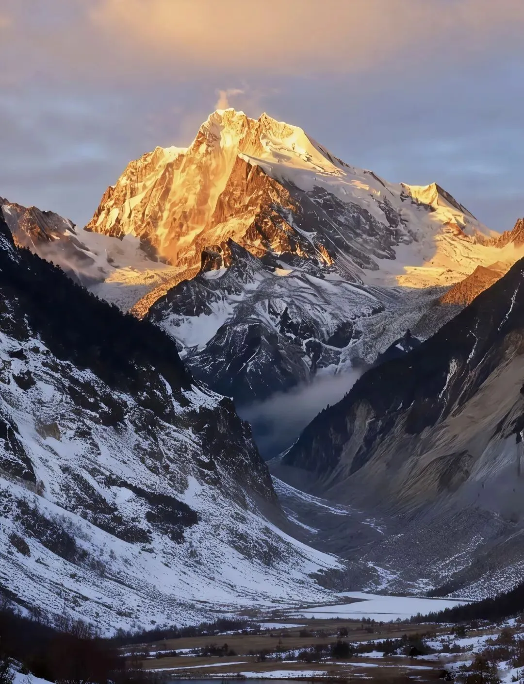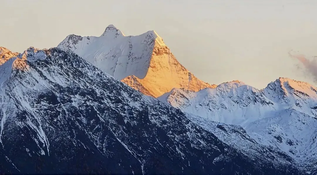 雪山盛景:远眺海拔7556米的贡嘎主峰,晴天时雪峰倒映在冰川湖泊中,日出时分金光洒顶,被誉为“贡嘎日出最佳观赏点”。