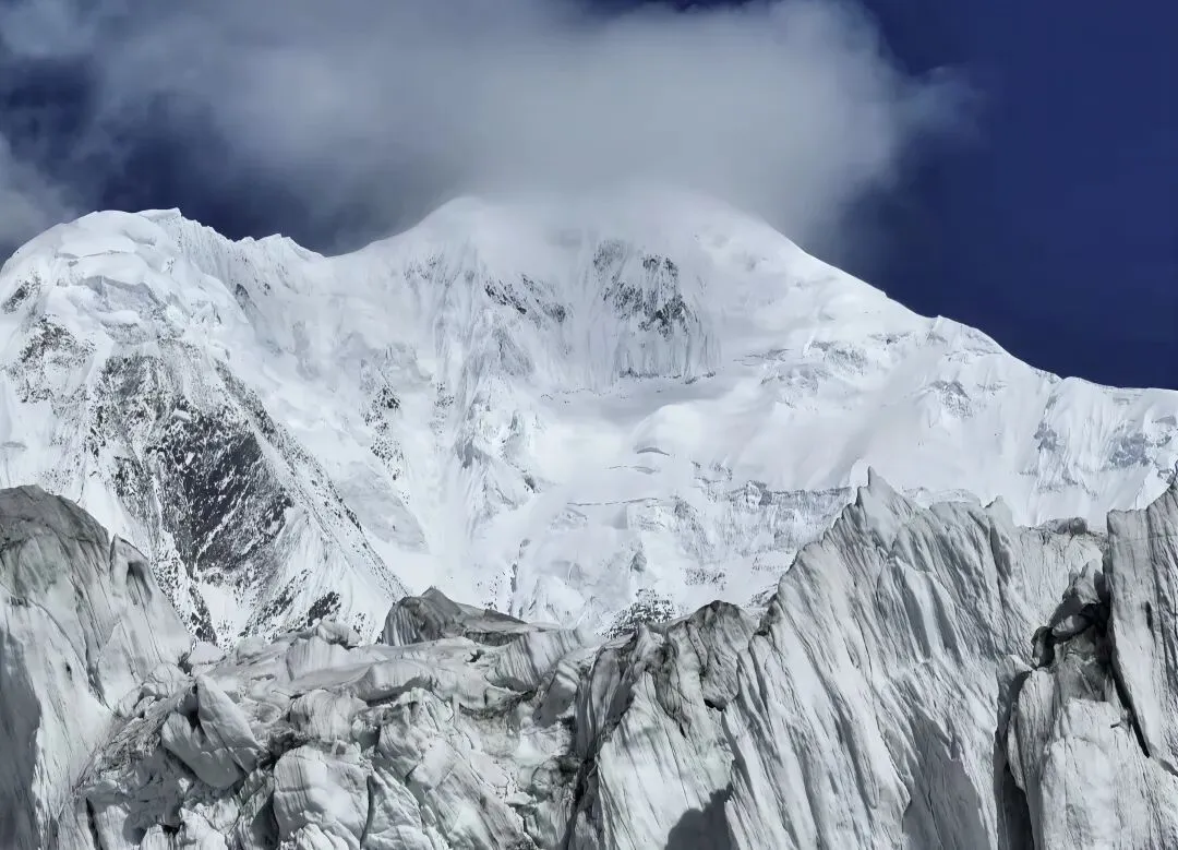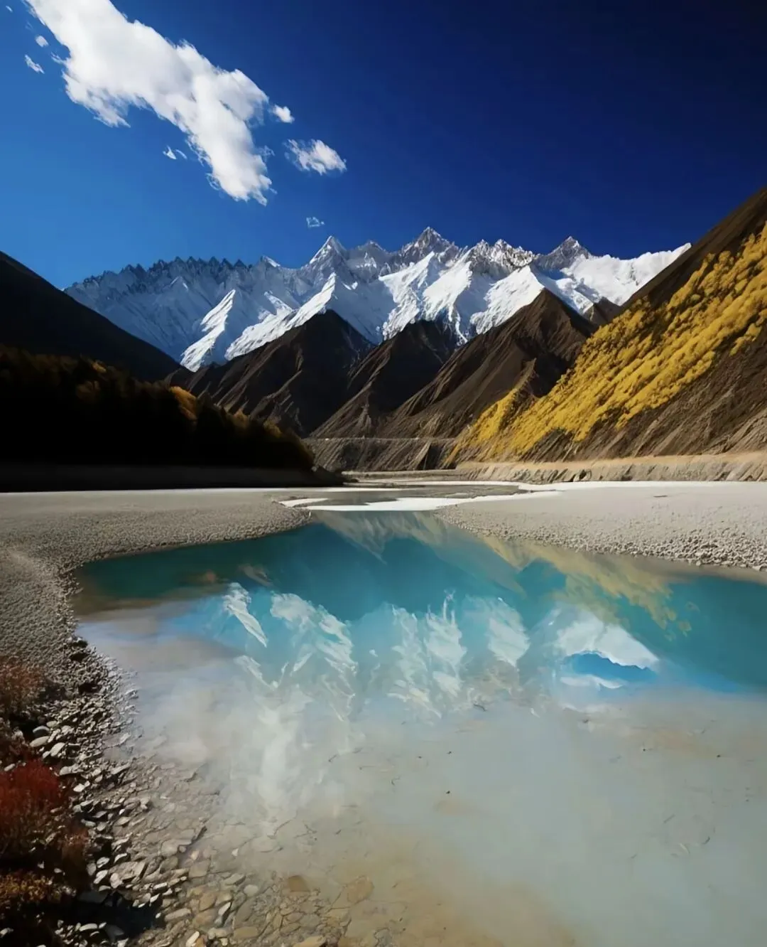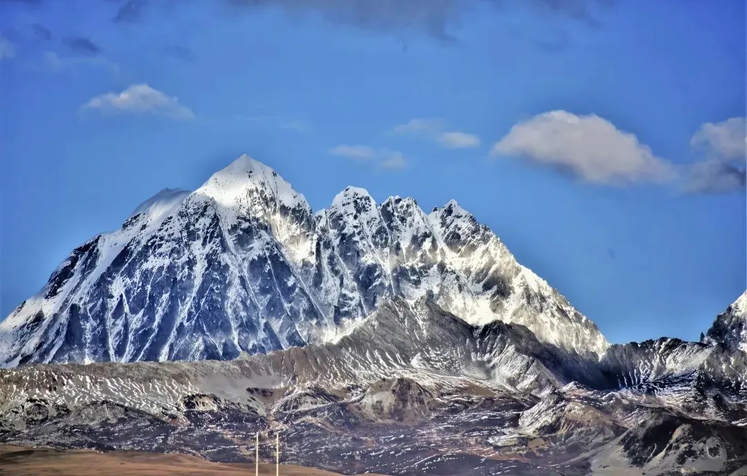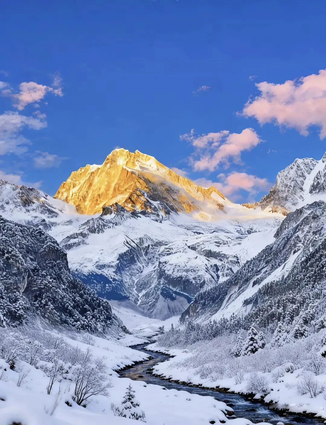雪山盛景:远眺海拔7556米的贡嘎主峰,晴天时雪峰倒映在冰川湖泊中,日出时分金光洒顶,被誉为“贡嘎日出最佳观赏点”。