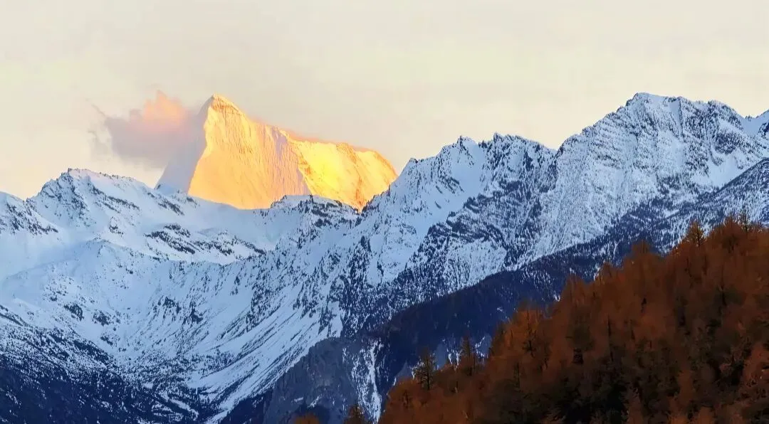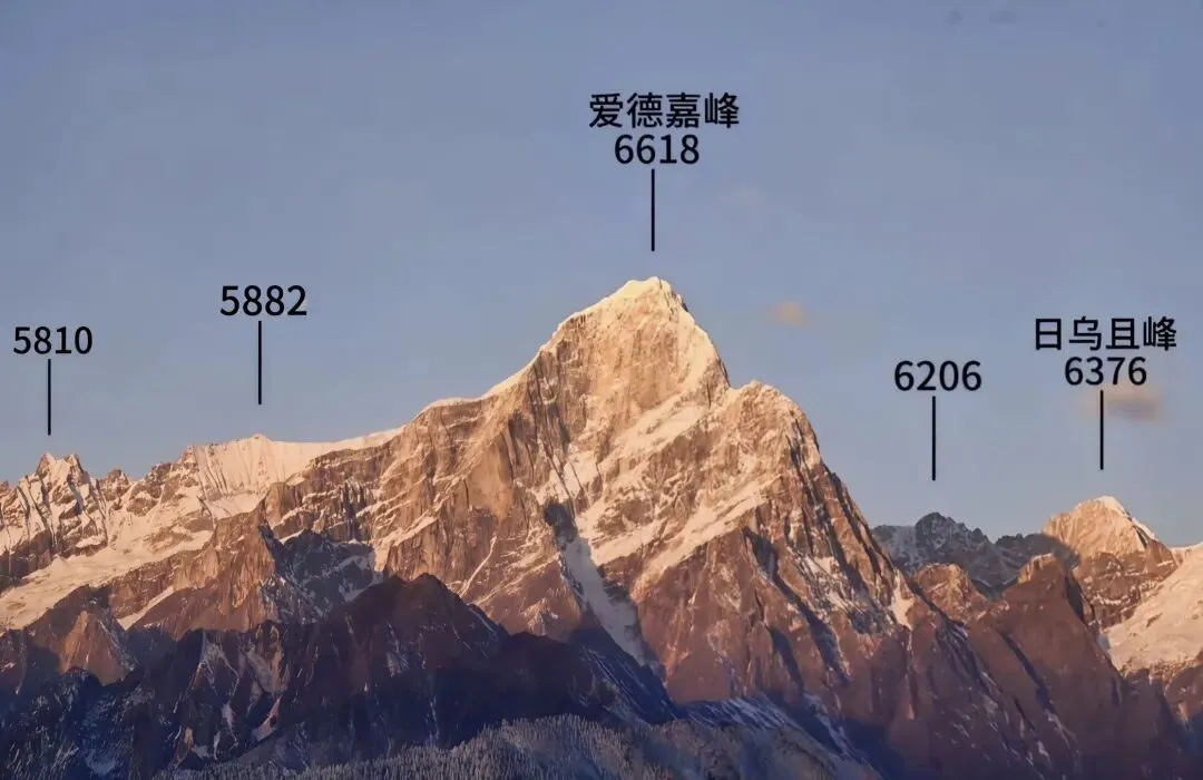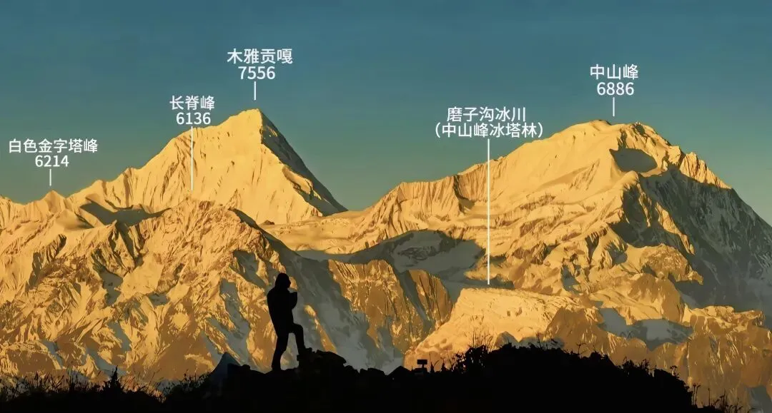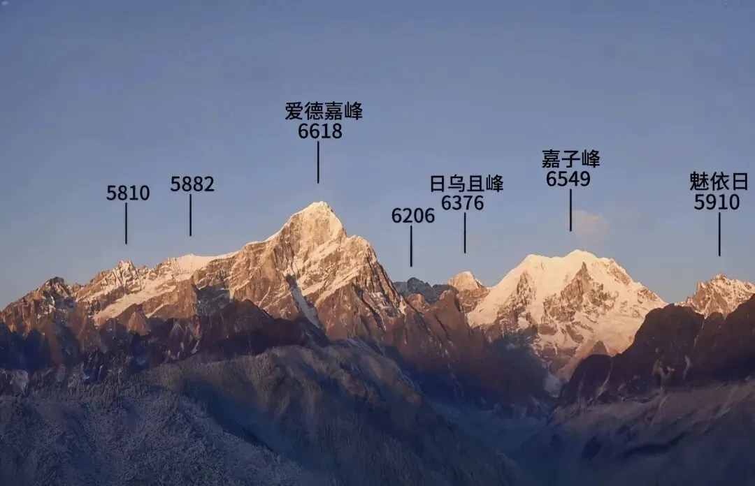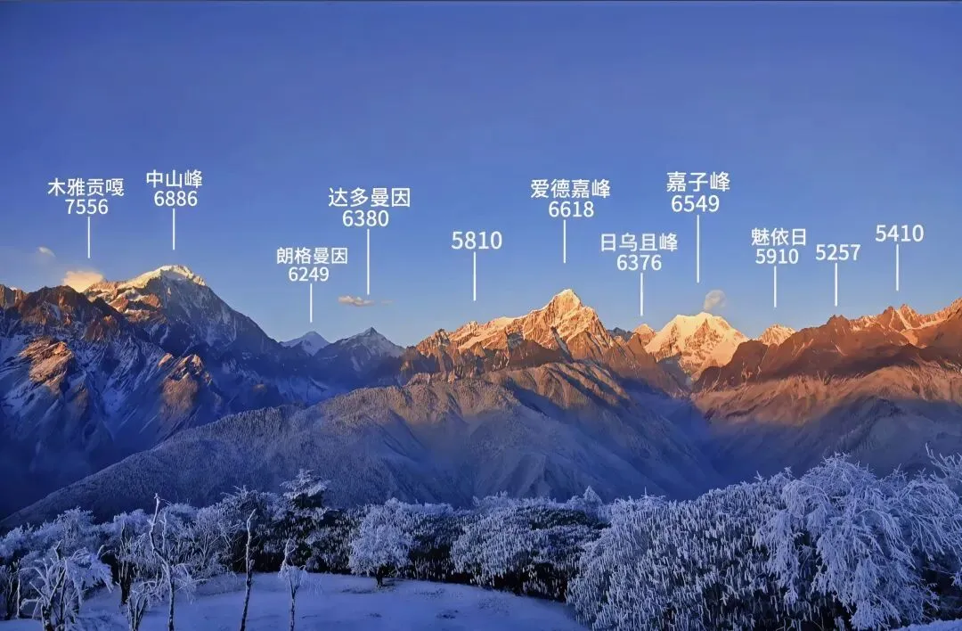 群峰观景台:远眺贡嘎雪山群峰,数十座雪山连绵起伏,气势磅礴,日落时分,夕阳为雪山镀上一层金边,景色震撼人心。
