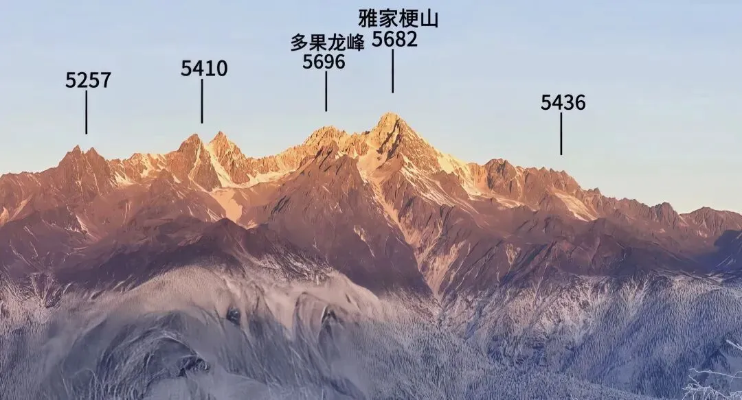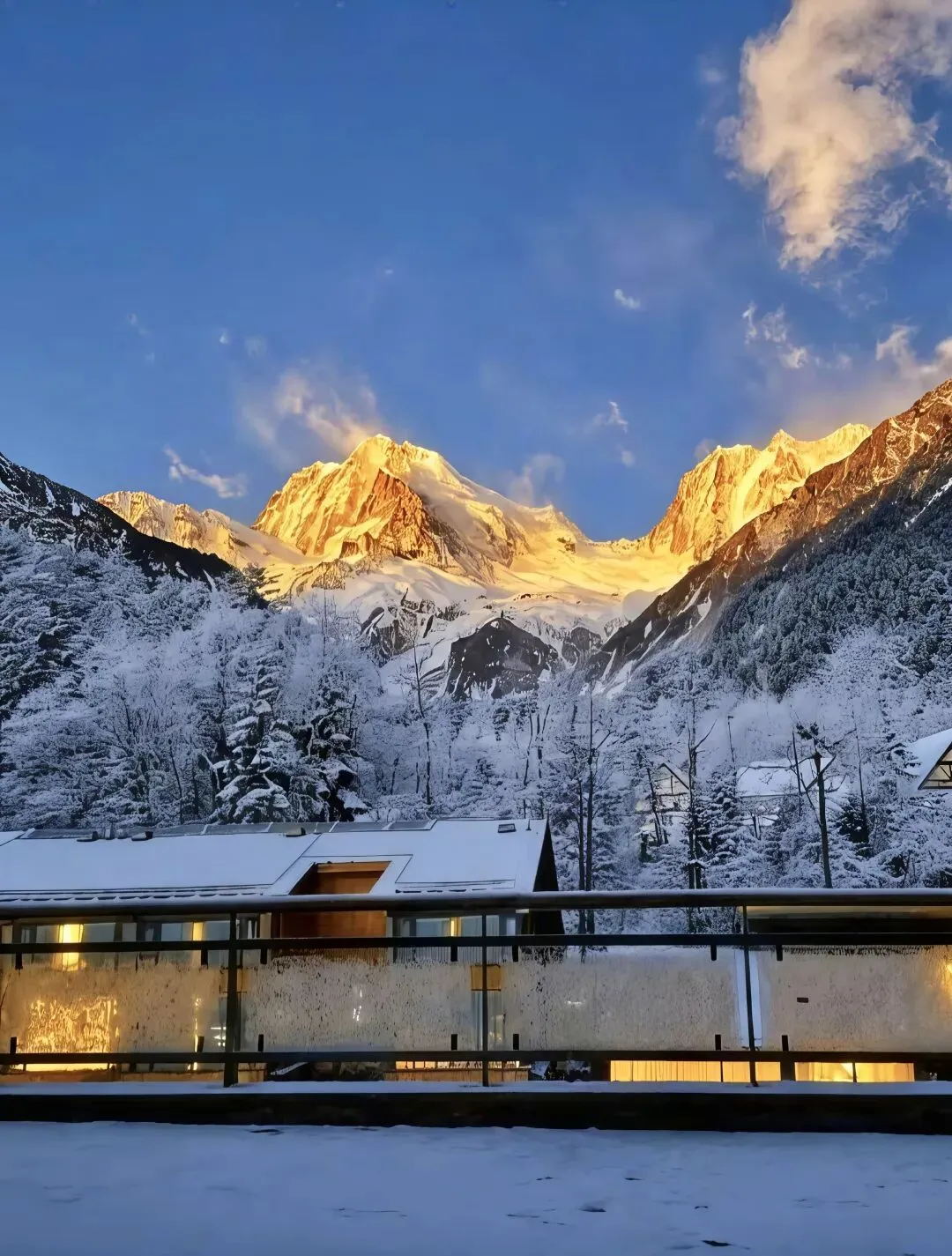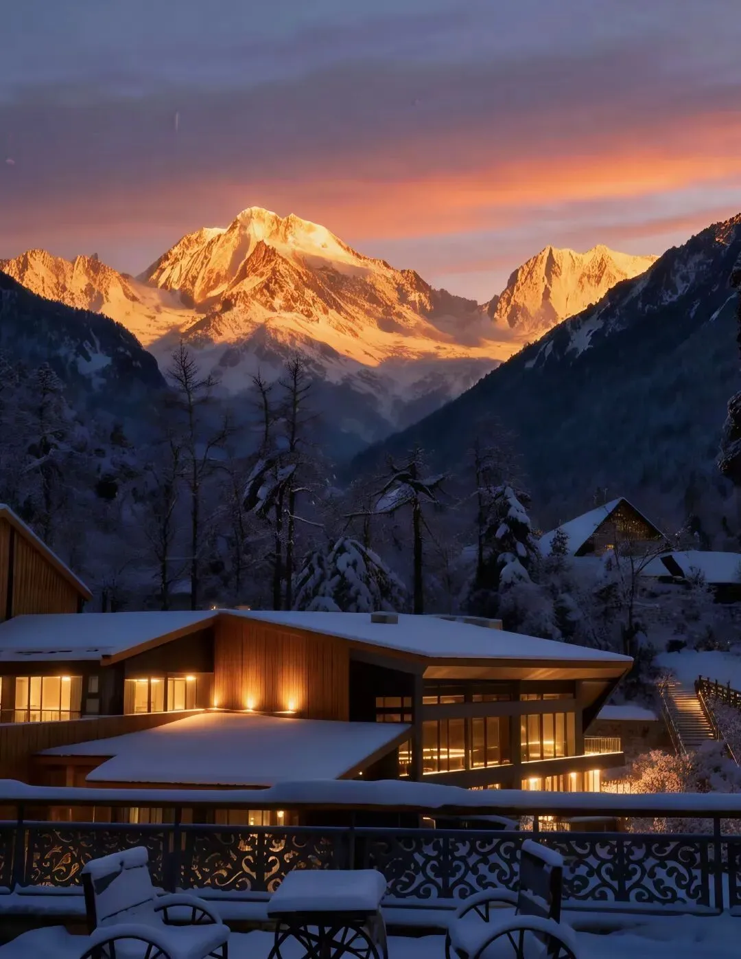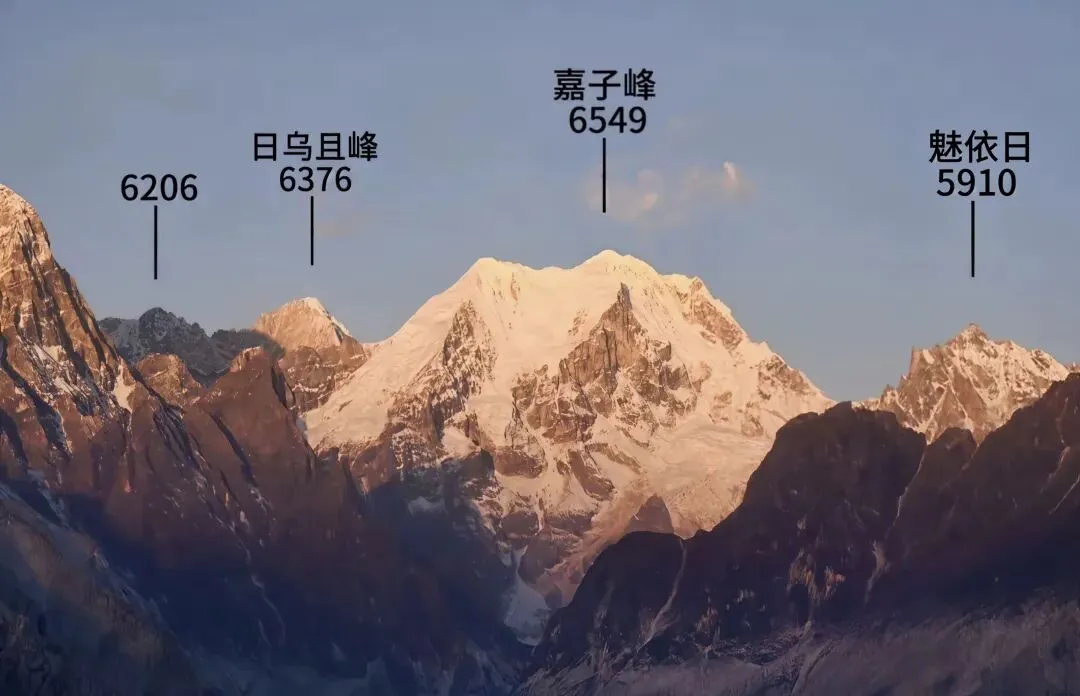 群峰观景台:远眺贡嘎雪山群峰,数十座雪山连绵起伏,气势磅礴,日落时分,夕阳为雪山镀上一层金边,景色震撼人心。