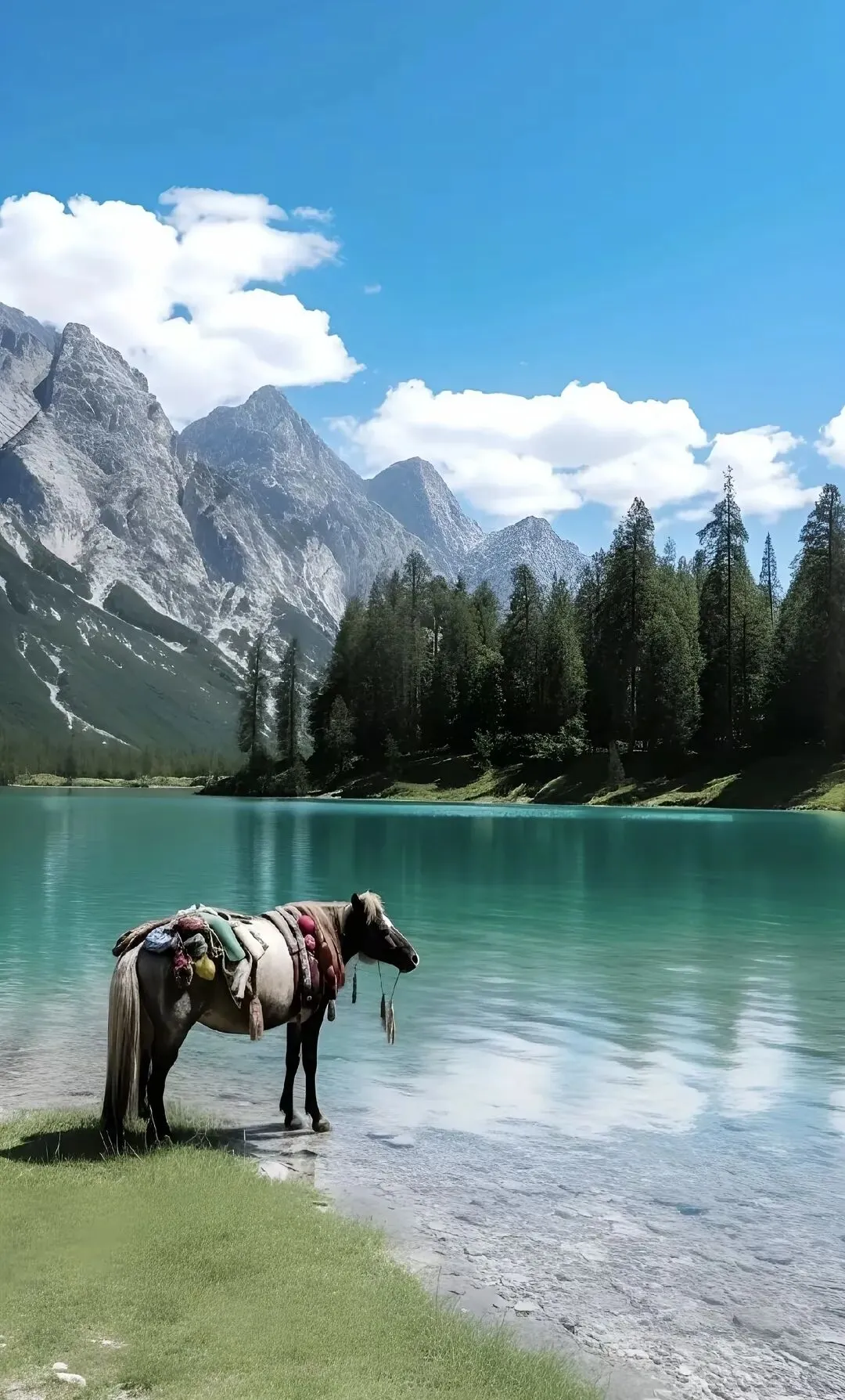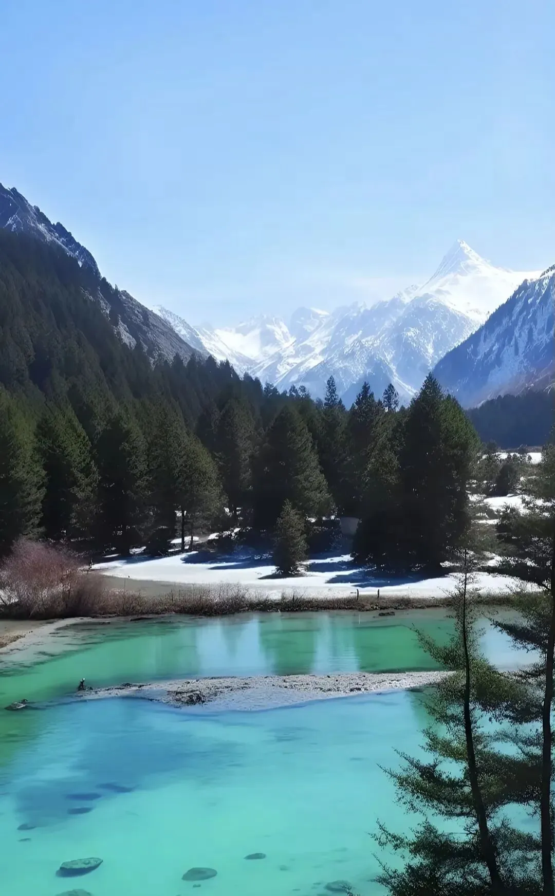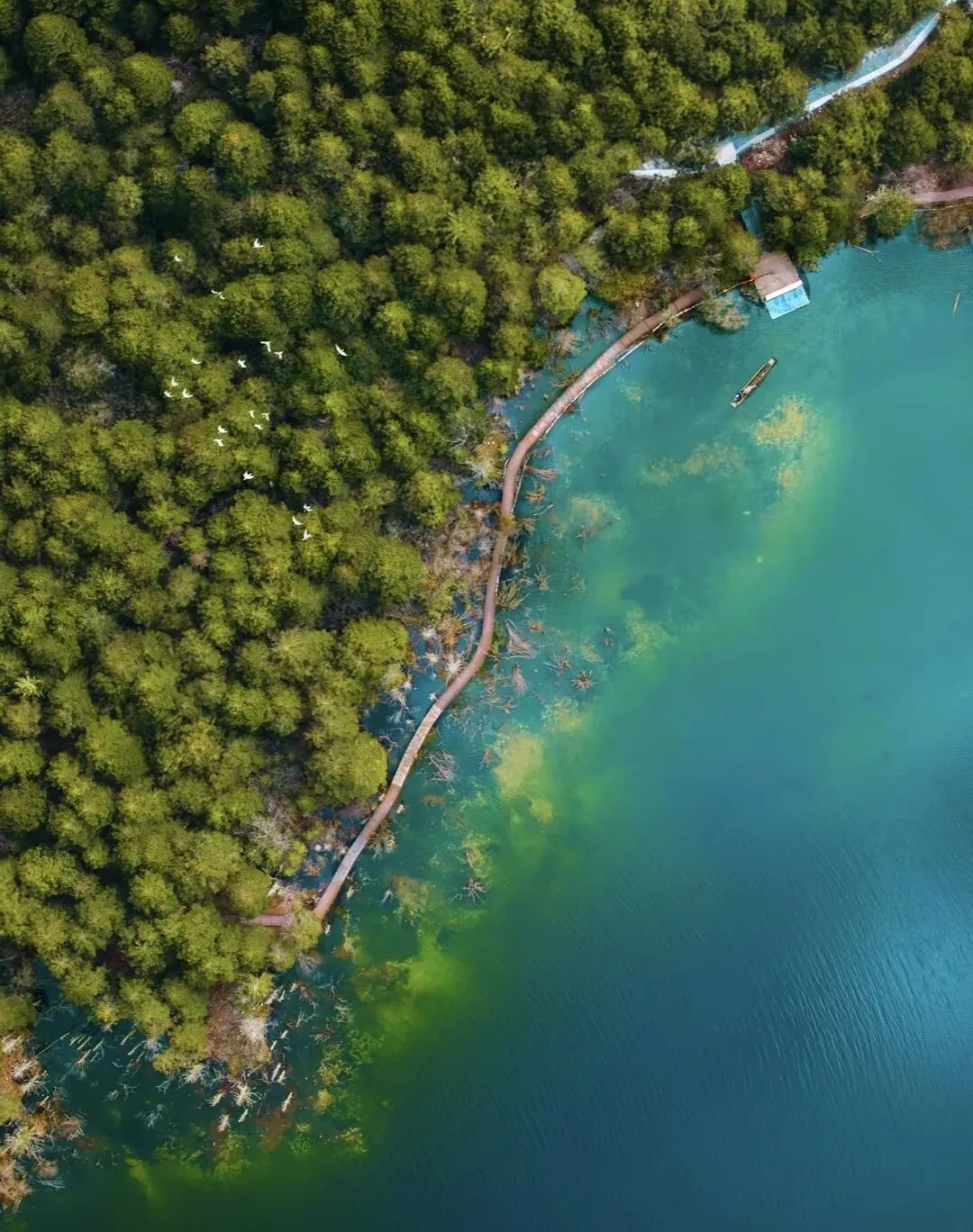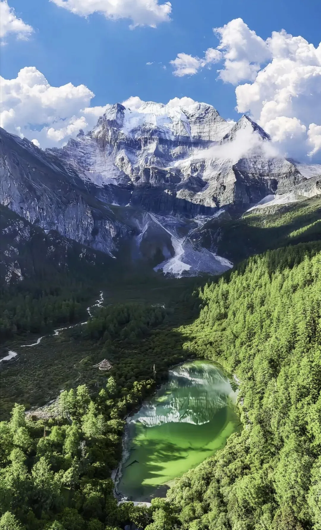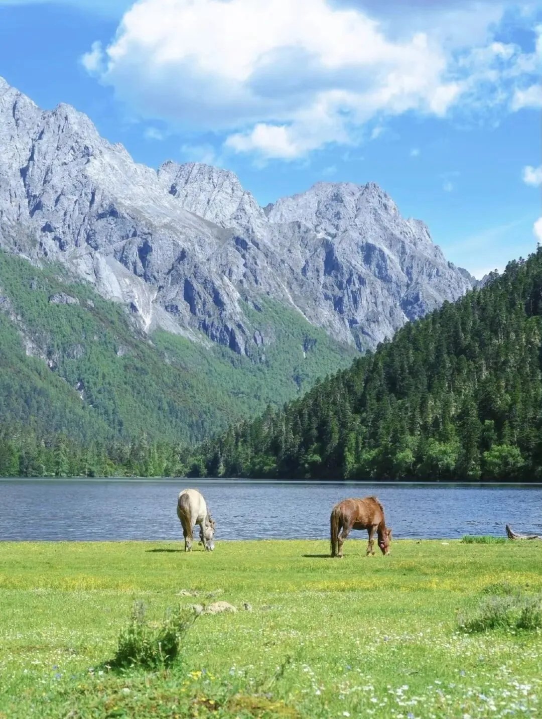 玉龙拉措湖:海拔4040米的高山湖泊,湖面面积约1.5平方公里,湖水清澈见底,四周雪山环绕,森林茂密。春季湖水泛绿,夏季湛蓝如宝石,秋季倒映彩林,冬季结冰如镜,四季景色迥然不同。