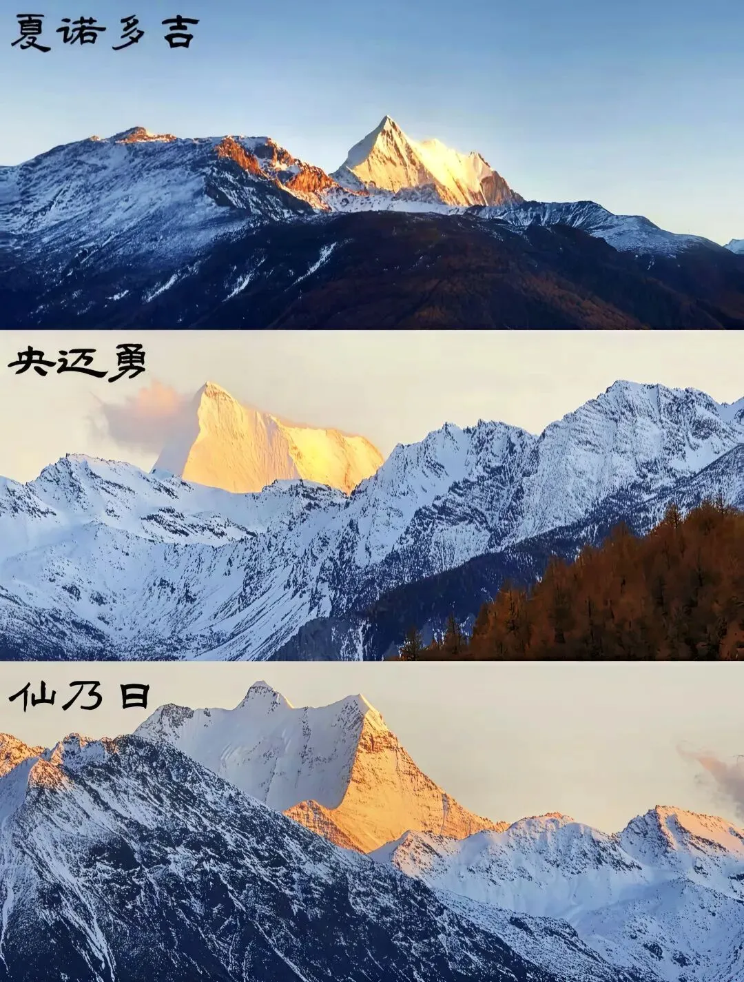 三座神山:仙乃日(海拔6032米,意为“观世音菩萨”)形似大佛端坐;央迈勇(海拔5958米,意为“文殊菩萨”)线条锐利如利剑出鞘;夏诺多吉(海拔5958米,意为“金刚手菩萨”)雄健刚毅,三座神山共同守护着这片圣洁之地。