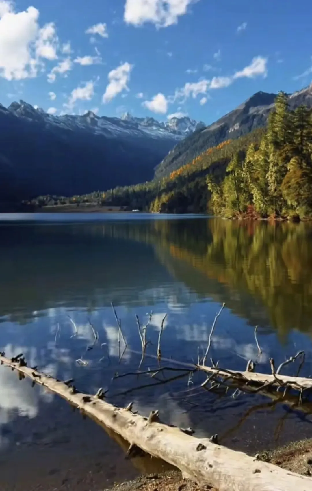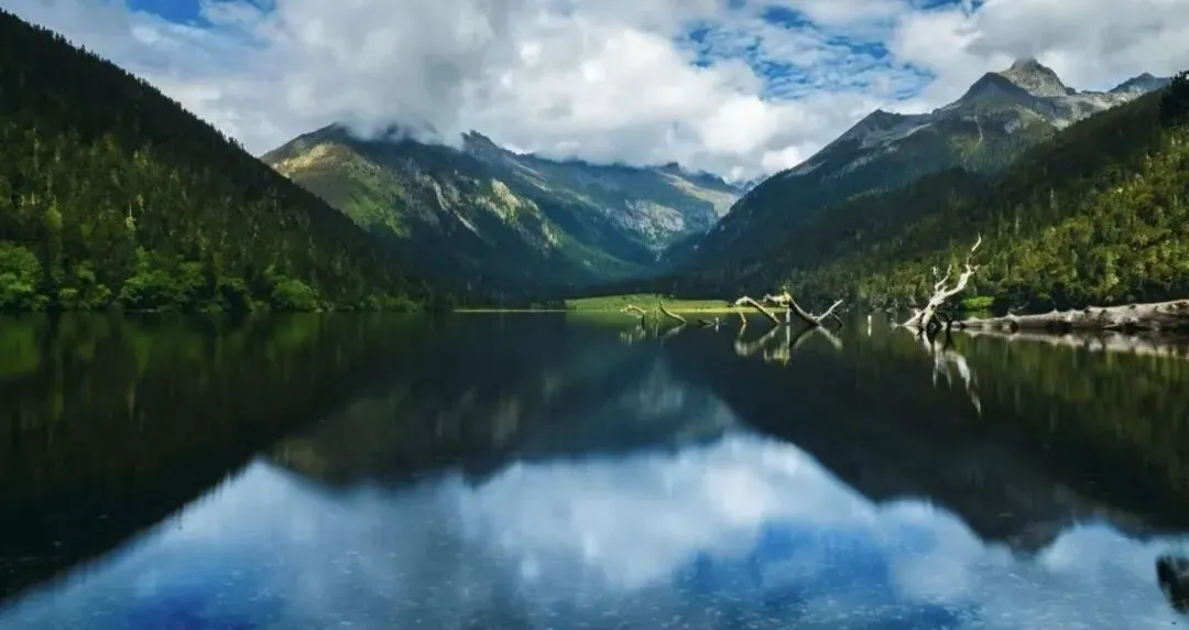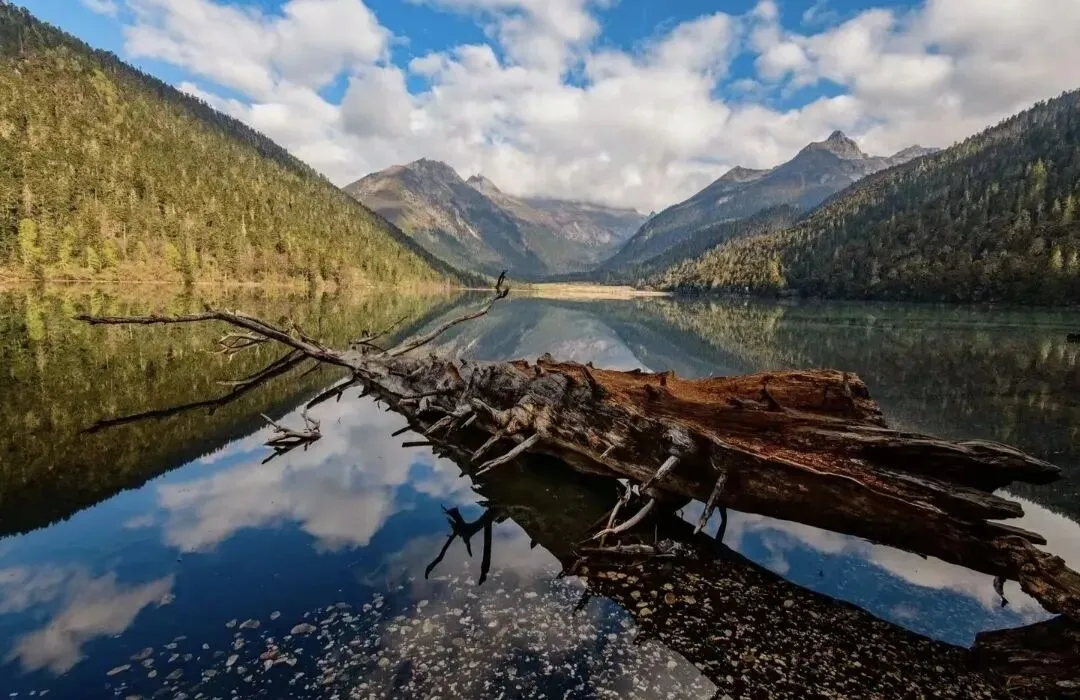 伍须海:海拔3760米的高山湖泊,湖水清澈见底,在阳光照射下微风荡漾,如星光闪烁、银河律动。湖泊四周是茂密的原始森林,远处是巍峨的雪山,倒影湖中,虚实难辨,构成一幅绝美的山水画卷。