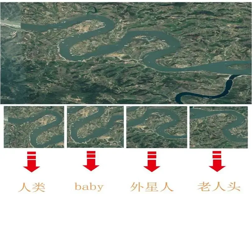 2.汉江五门锁江的形状分别为人头、外星头、婴儿头、老人头,代表从生到死从幼到老的衍变,是不是外星人通过勾划河道创造大地艺术,暗示这里是生命之门、暗示人类与外星人有紧密关联、暗示这里是外星人出入地球的门户?