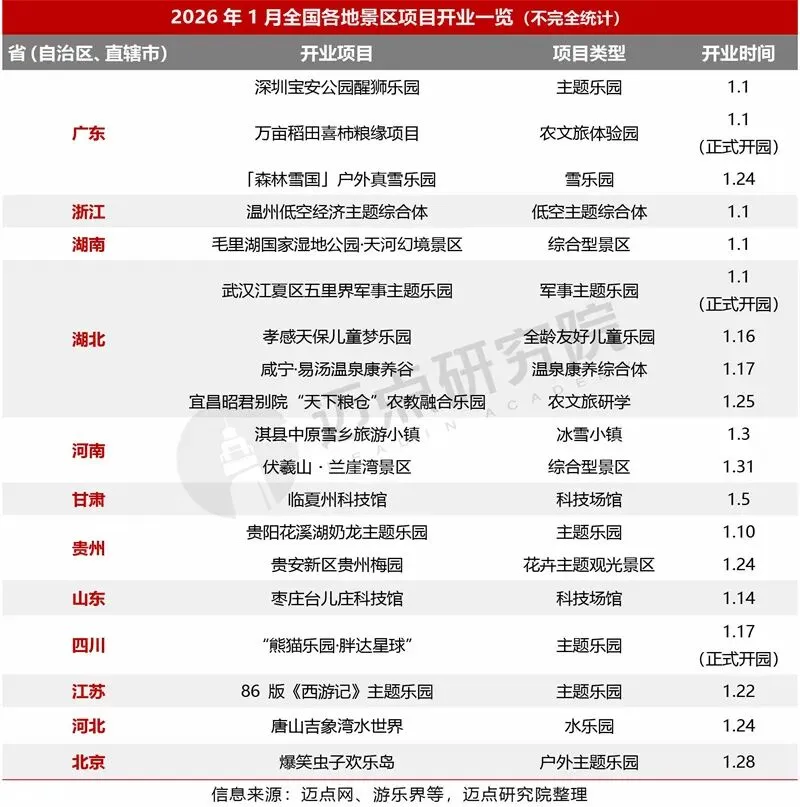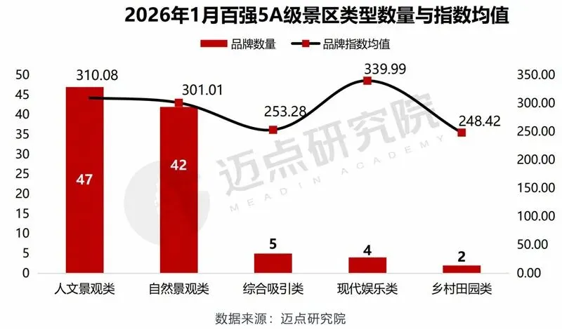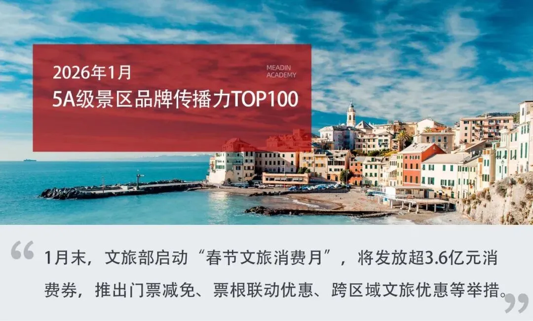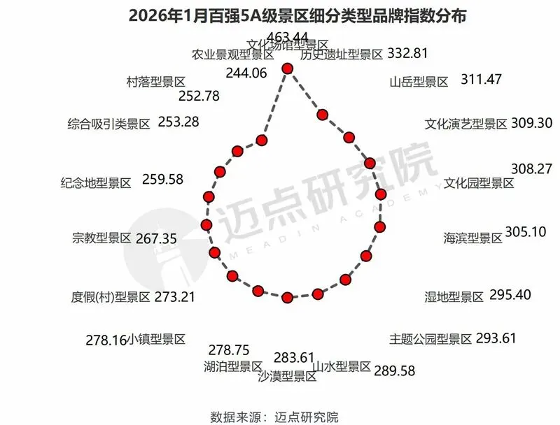 “2026年1月5A级景区品牌传播力100强榜单”数据来源于迈点品牌指数MBI,根据1月迈点品牌指数MBI的358家景区数据汇总统计而成。具体说明如下: