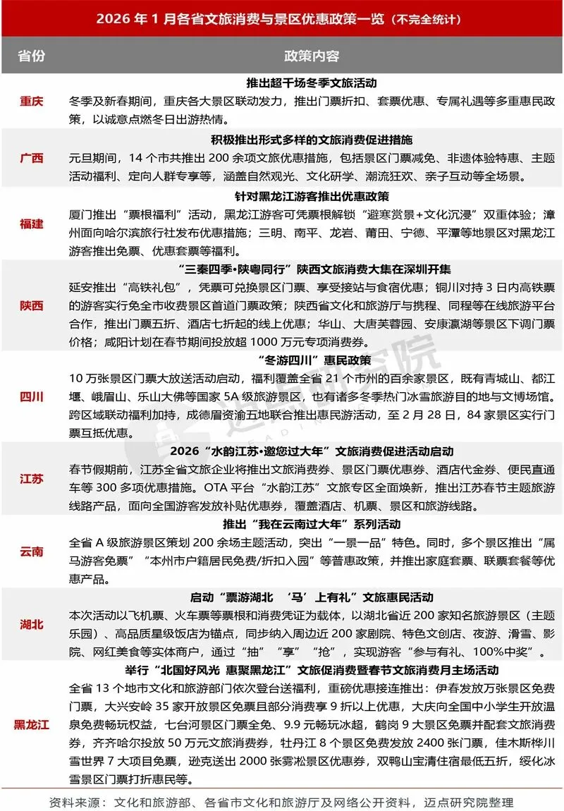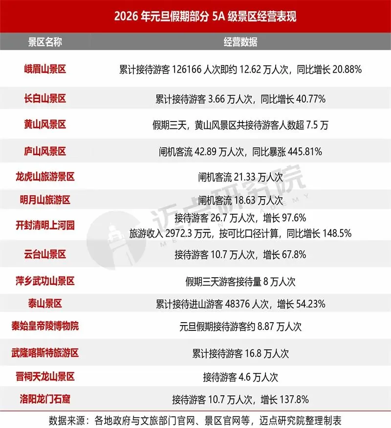 2026年元旦三天小长假,游客通过北上赏雪、南下避寒、祈福静心、观演赏秀等多元游玩方式,解锁迎接新年的N种仪式感,带动景区客流人气上涨、激活景区消费潜力。例如以庐山风景区为例,元旦假期景区以雪为媒推出云端跨年之夜、音乐节、第六届冰雪嘉年华等活动,将冰雪盛景与潮流玩法深度融合,游客接待量暴涨,据江西省文化和旅游厅公布数据,其闸机客流42.89万人次,同比增长445.81%,位列全省景区客流榜首。再以开封清明上河园为例,加强“文旅+沉浸式演艺”“文旅+科技”深度融合,推出《清明上河·宋宴》沉浸式餐秀、《清明上河图:千年之约》XR大电影等创新业态产品,元旦假期景区旅游收入2972.3万元(位列河南省第一),按可比口径计算,与2025年元旦相比增长148.5%。此外,以峨眉山、长白山、泰山为代表的传统热门景区,元旦假期亦表现良好,游客接待量均呈现“两位数”增长。