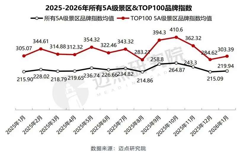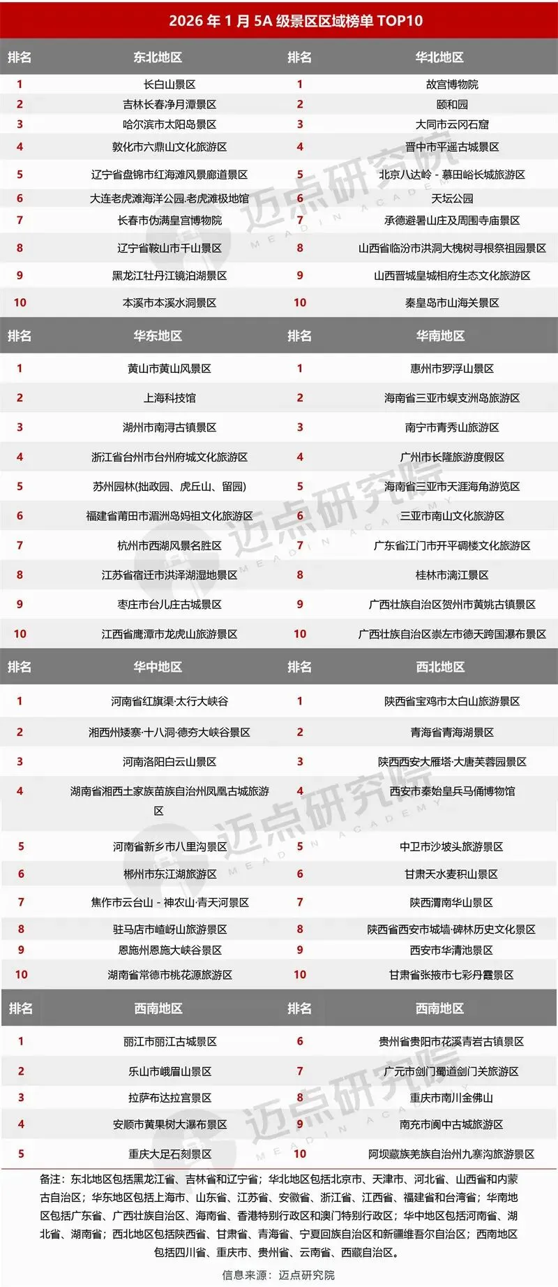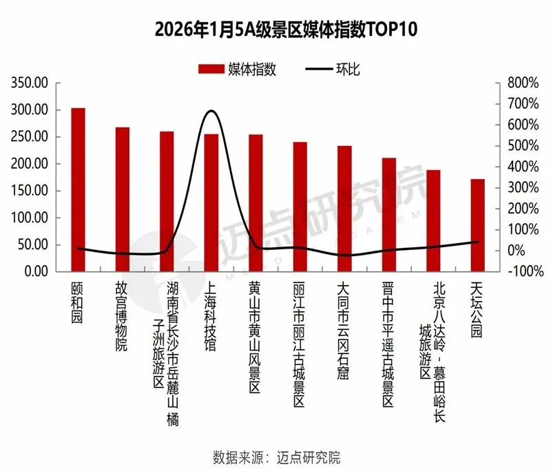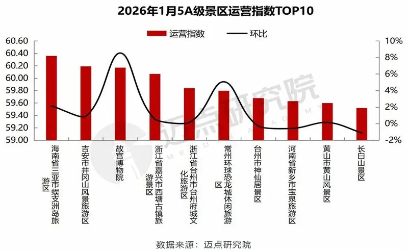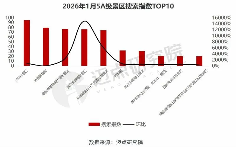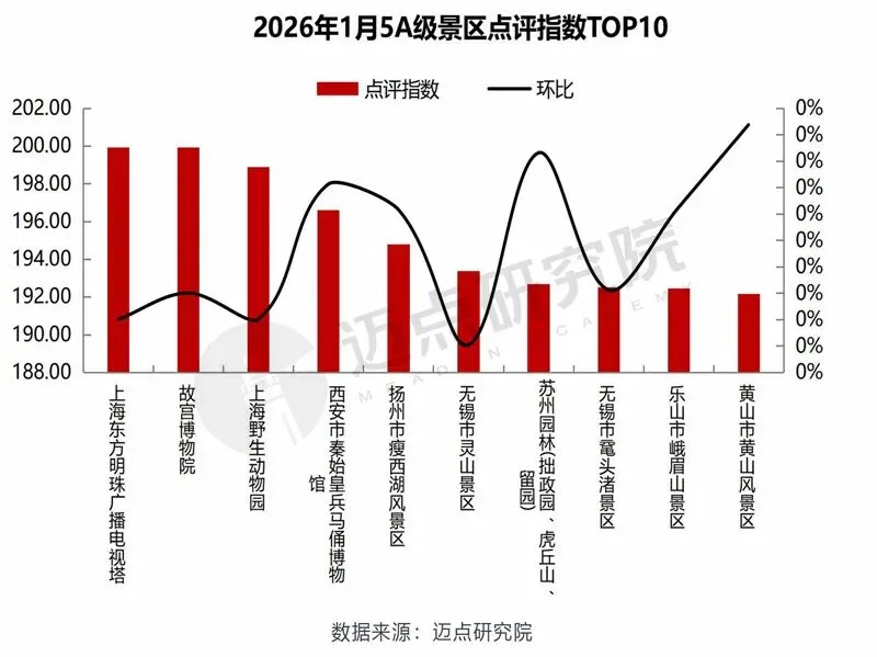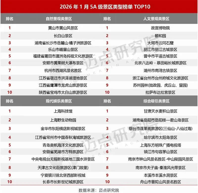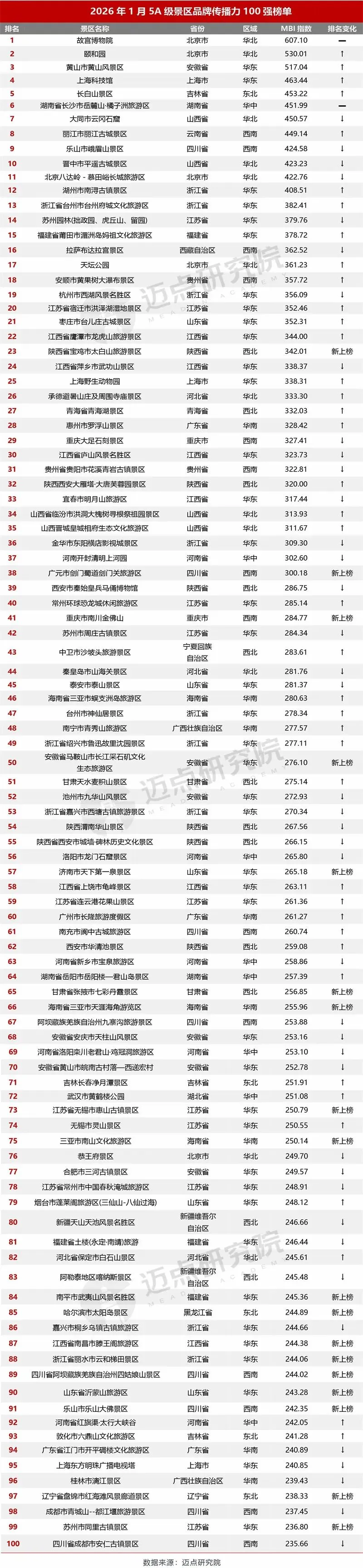 以下是迈点研究院独家发布“2026年1月5A级景区品牌传播力(MBI)100强榜单”。1月,故宫博物院、颐和园、黄山市黄山风景区、上海科技馆、长白山景区、湖南省长沙市岳麓山·橘子洲旅游区、大同市云冈石窟、丽江市丽江古城景区、乐山市峨眉山景区、晋中市平遥古城景区位列榜单前十。本月百强景区中,排名环比上升和下降的各40家、排名不变的2家、新上榜18家。