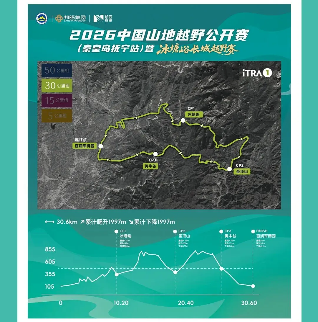 耐吉赛事!纵横山海!2026中国山地越野公开赛(秦皇岛抚宁站)暨冰塘峪长城越野赛定于4月25日-26日在河北省秦皇岛市抚宁区百润军博园开赛,设50公里、30公里、15公里、5公里四个项目;2月11日10:00开启报名,额满即止!3月10日18:00前报名享受早鸟价!