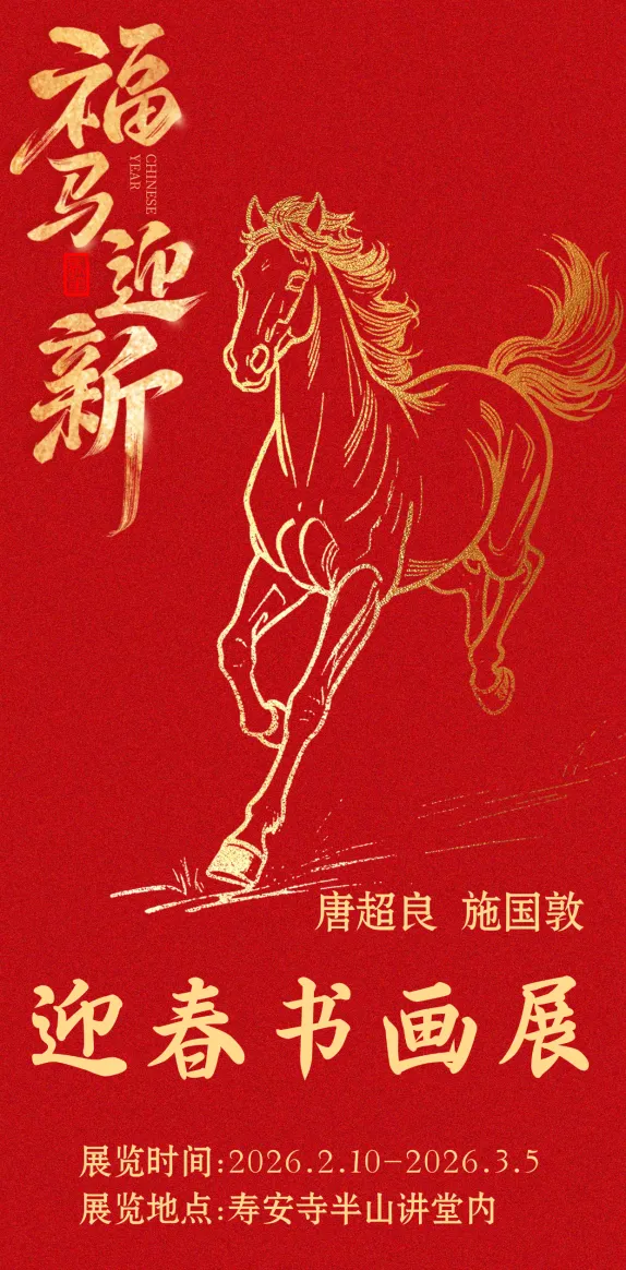 岁逢丙午,春启新章。2026年2月10日,“唐超良、施国敦迎春书画展”于上海崇明区寿安寺半山讲堂隆重开幕。本次展览由崇明区佛教协会主办、崇明佛教书画院承办,汇集两位老师的精心之作,以笔墨绘时代气象,以丹青传新春祝福,呈现一场禅意与艺术交融的视觉盛宴。