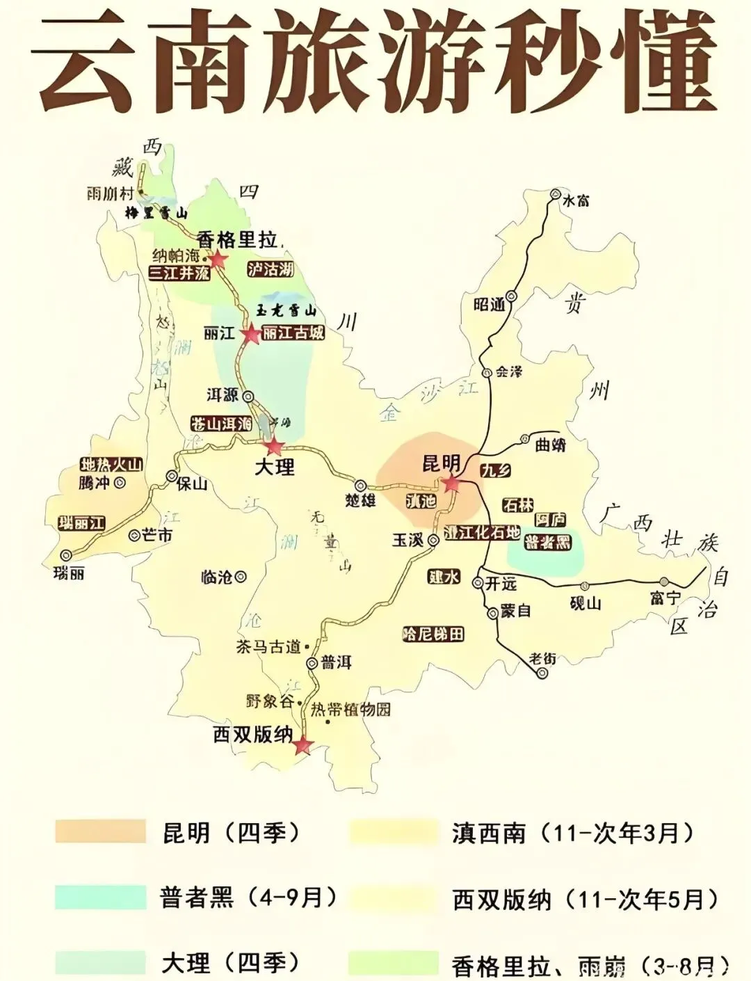 云南热门的旅游线路有三条,主要为滇南路线、滇西南路线和滇西北路线。滇南路线为从昆明市往南,途经玉溪市、普洱市,最后抵达西双版纳州,主要体验热带风情和傣族文化。滇西南路线和滇西北路线起始点都是先从昆明向西,经楚雄市后到达中转站大理市。在大理游玩后,向北的线路依次为丽江市和迪庆州的香格里拉,向西偏南的路线则先到保山市,然后转去德宏州的芒市,逛完再回来逛保山市的腾冲,两个方向的路程都差不多。 网上找了张云南旅游路线图,给大家看下有个大概的印象。