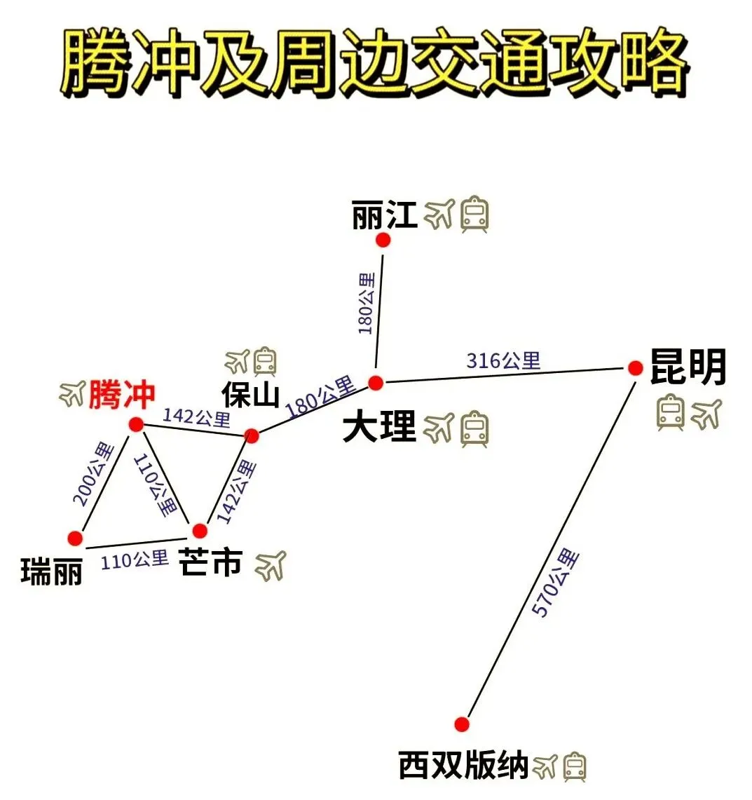 滇西南路线可以选择自驾游、高铁、大巴车或者飞机,各人因人而异。有飞机场的是:腾冲、保山、大理和芒市,高铁可以从昆明到大理再到保山,腾冲和芒市暂无高铁站。