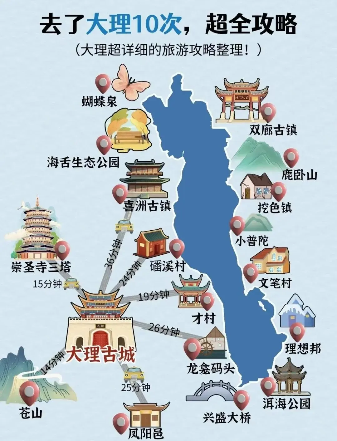 逛完楚雄,下一波直接赶往大理市。大理应该在全国都是出了名的城市,网红景点除了苍山、洱海和三塔,还有双廊古镇、喜洲古镇、S湾等。爬苍山费时间,峡谷还多,赶时间的可以白天先去才村码头坐船看半个洱海。坐船个人感觉湖边景色一般,但是可以看到苍山的丛山峻岭以及众多峡谷。云南的平地不多,但凡有大湖泊的必定有平地和依托平地而建造的城市。大理依洱海而建,昆明依滇池而建,澄江依抚仙湖而建,其他湖泊城市也有很多。