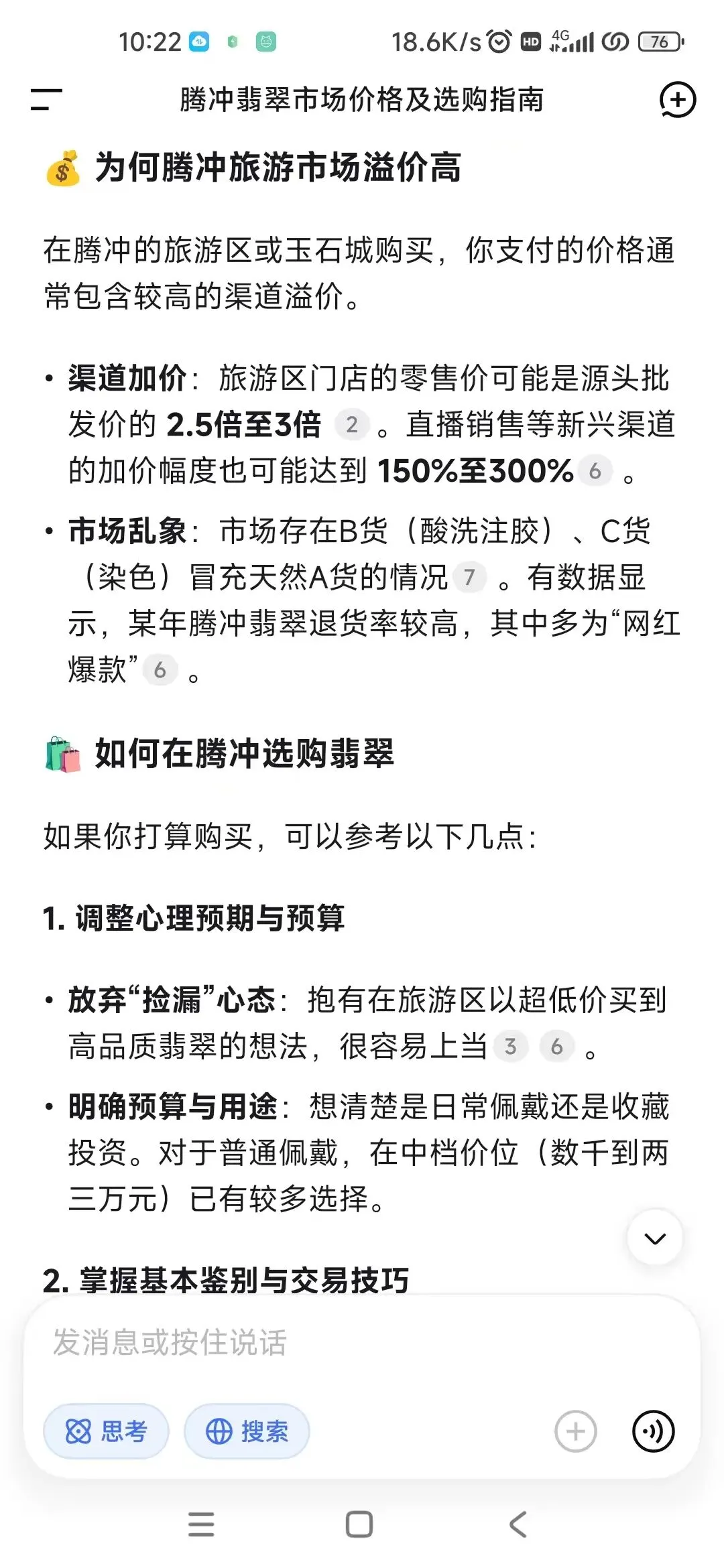 腾冲还是一个重要的翡翠玉石加工中转基地,许多外地的旅游团,尤其是低价购物团,来到这里的一个重要原因就是买翡翠玉石。这里全城遍布大小不一的翡翠玉石店和赌石场所,有开放式购物和封闭式购物两类。带团的导游们也会在行程的几天内反复讲解玉石的故事,以及各种发财故事。有兴趣的可以根据自己的经济实力适量买一些留做纪念,据说当地政府承诺各大店铺不会卖B货和C货,绝对保真保A。花个几百几千块就当买个开心,上万需要谨慎,当然家里有矿的富哥富姐随意,可以顺便V我50。 哦,价格你可以大刀猛砍,根据各人砍价的道行来定最终价格。看见过同行的团友150元买个两个不错的玉石挂饰,而我给100元都买不到一个差不多的。
