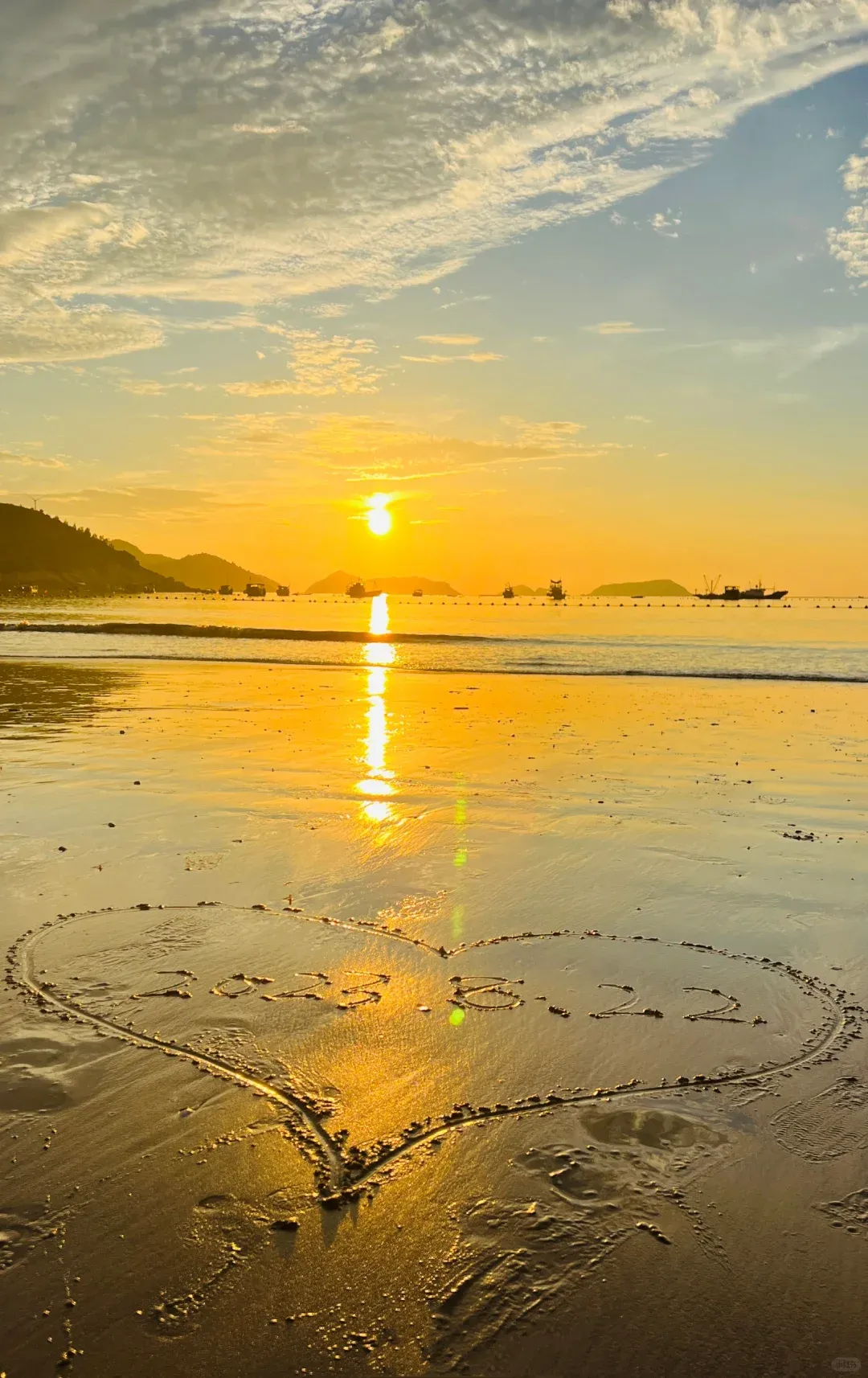 当太阳缓缓沉入海平线,金色的阳光洒在海面上,波光粼粼,与远处的山峦、近处的沙滩和人群交相辉映,构成了一幅绝美的画卷。