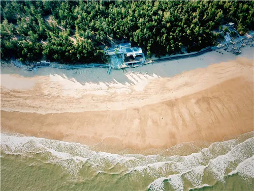 沙滩前方有玲珑奇特的笔架山,石奇岩异,风光独秀。当天空中出现彩霞时,与海天形成渐变色,绚烂多彩,海天一色更是美不胜收。