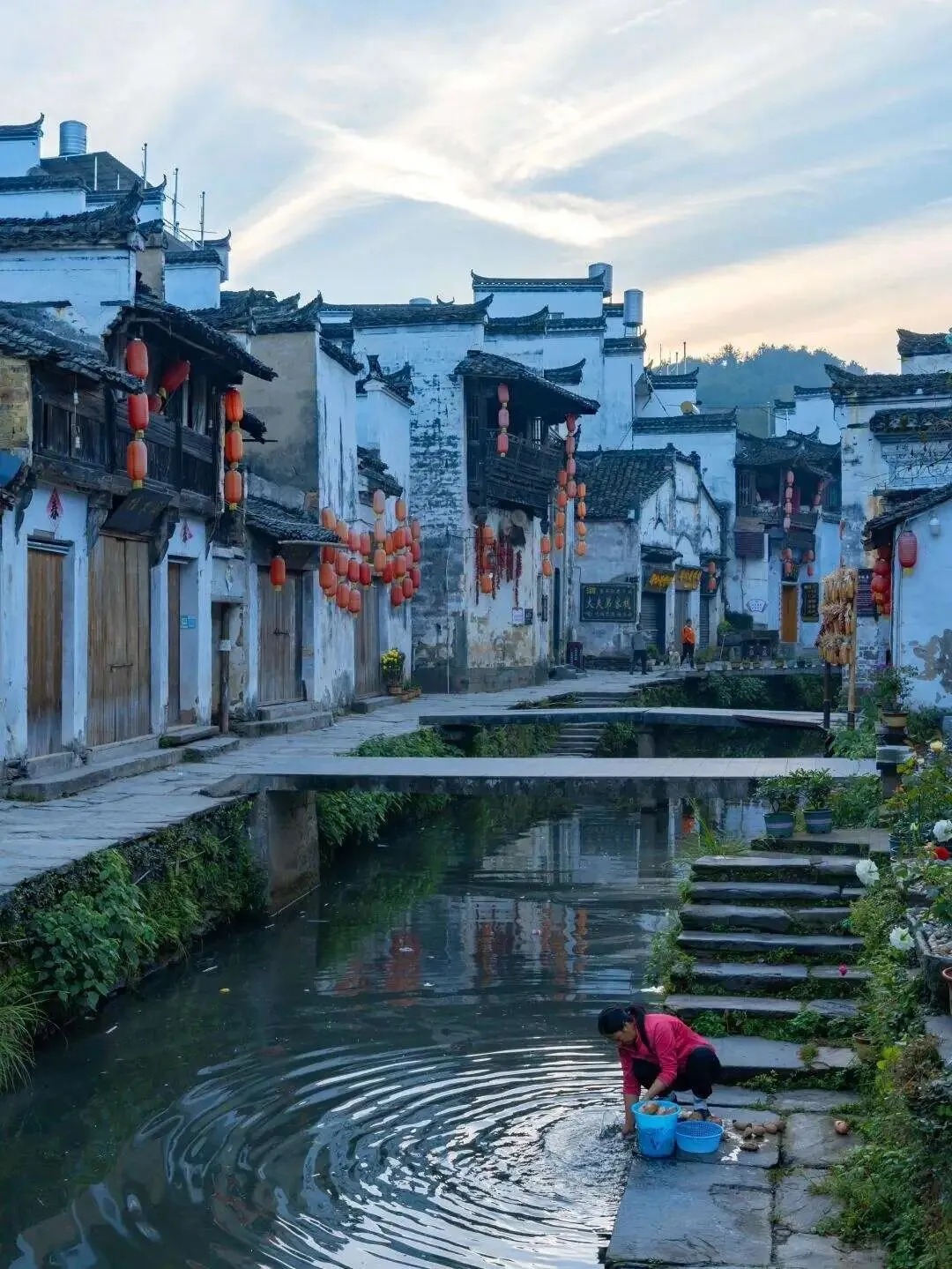 赶在晨雾未散时进篁岭,白墙黑瓦的村子挂在.半.山腰。.晒秋的.竹匾刚支出来.,辣椒红,.玉米黄。.中.午走累了,随便找家饭馆,点.个糊豆腐,热.乎乎一碗下.肚,看窗外.小河慢悠.悠.淌过去.。