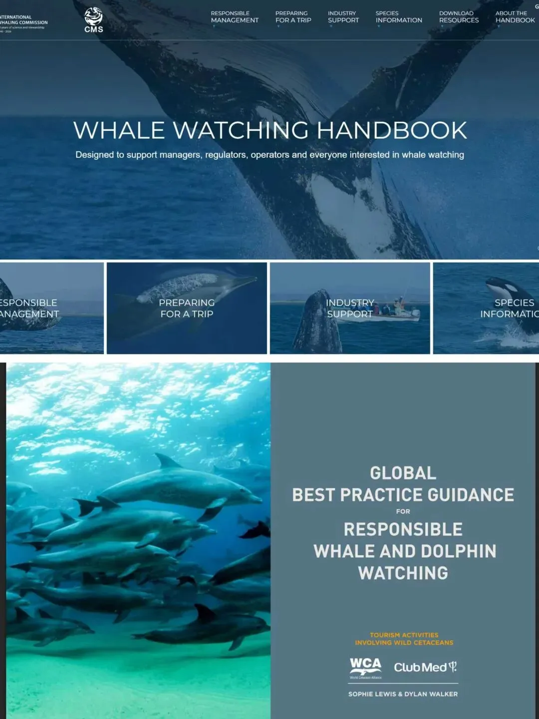 IWC观鲸手册和WCA(世界鲸类联盟)负责任的鲸鱼和海豚观赏活动指南 通用的安全观鲸规则包括: