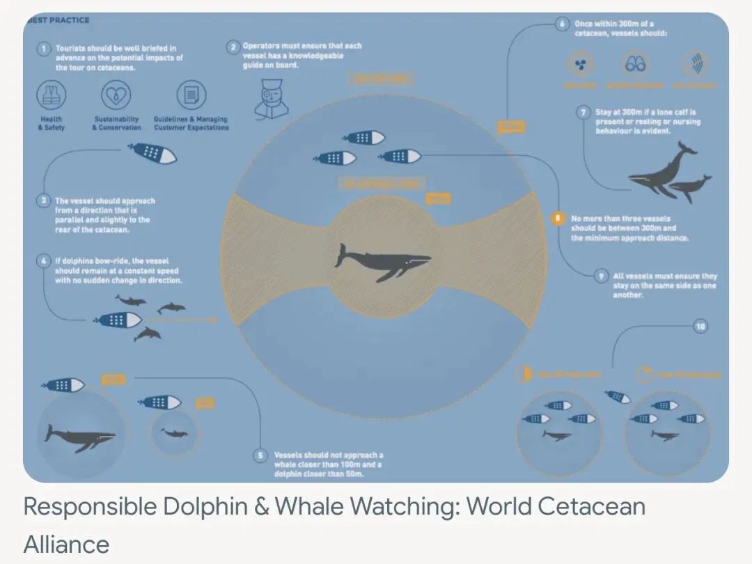 保持距离:至少保持100米距离,若有幼鲸则保持200米;应从侧后方接近,避免包围。 控制速度:在300米内应减速至怠速(5-6节)。 限制船只:同一区域限3—4艘船,每组观察时间控制在30—60分钟。 规范行为:严禁追逐、触摸、投喂;若发现受伤鲸鱼应及时报告。 运营商责任:需取得许可并接受培训,对游客进行科普教育。