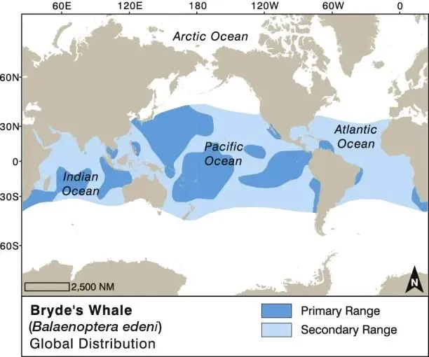 布氏鲸的全球分布,引自IWC 成年布氏鲸体长10—14米,体重10—20吨,背部呈深灰色,腹部浅色。其头部有三条明显的脊线(主脊加两副脊),这是区别于其他须鲸的显著特征。它们主要分布在热带和亚热带海域,不进入寒冷极地。