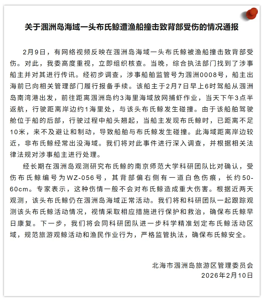 2月9日,有网络视频反映在涠洲岛海域一头布氏鲸被渔船撞击致背部受伤。对此,我委高度重视,立即组织核查。当晚,综合执法部门找到了涉事船主并对其进行传讯。经初步调查,涉事船舶监管号为涠洲0008号,船主出海前已向相关管理部门履行报备手续。该船主于2月7日早上6时驾船从涠洲岛南湾港出发,前往距离涠洲岛约3海里海域放网捕虾作业,当天下午3点半返航,行驶距离岸边约1海里处,与该头布氏鲸发生碰撞。由于该船舶驾驶舱位于船的后部,行驶过程中船头翘起,当船主发现布氏鲸时,已距离不足10米,来不及避让和制动,导致船舶与布氏鲸发生碰撞。此海域距离岸边较近,非布氏鲸经常出没海域。我们将对此事件进行深入调查,并根据相关法律法规对涉事船主进行处理。