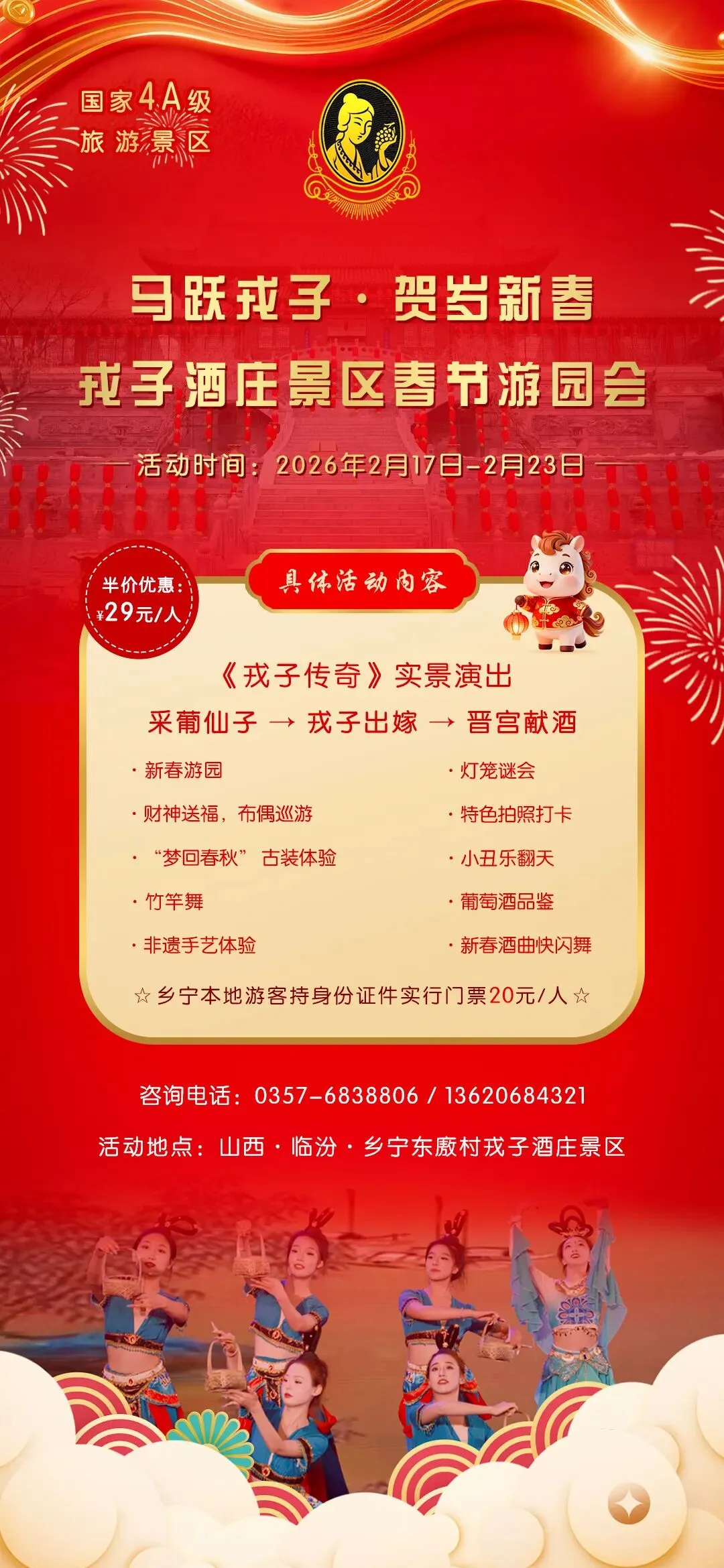 活动时间:2026年2月17日——2月23日 咨询电话:0357-6838806/13620684321 随着春节的脚步越走越近,喜庆的氛围愈发浓厚,为了迎接新春佳期的到来,戎子酒庄早已精心筹备、盛装打扮,处处张灯结彩,披上了一袭绚烂的节日盛装。一场别开生面、精彩纷呈的“马跃戎子,贺岁新春”春节游园活动即将在这美好时段热烈启幕,在此,诚挚地邀请四海宾朋齐聚一堂,共襄这场盛大而欢乐的新春庆典!