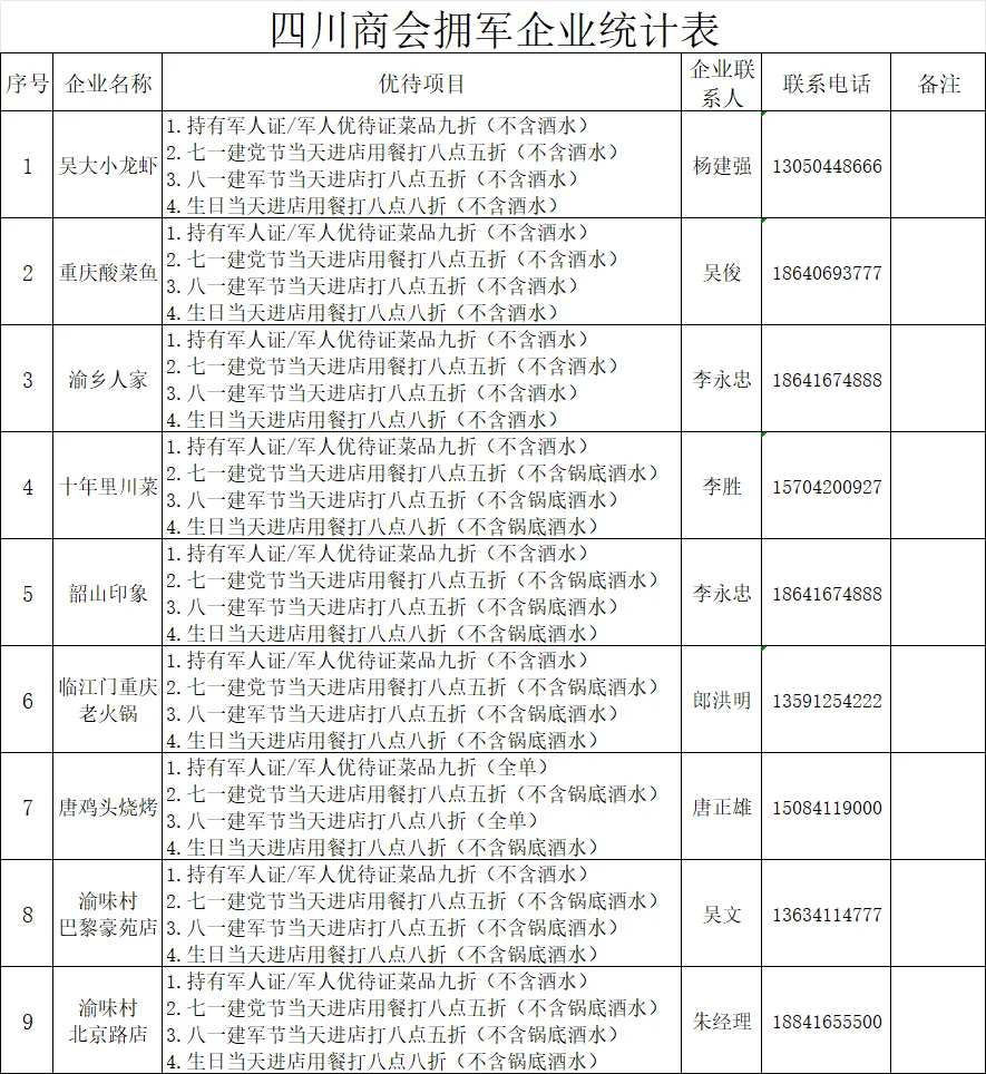 四川商会推出9家 极具当地特色的餐厅 战友们持证即可享餐品折扣 七一建党节、八一建军节 生日当天还有更多惊喜优惠 具体优待清单 👇👇👇