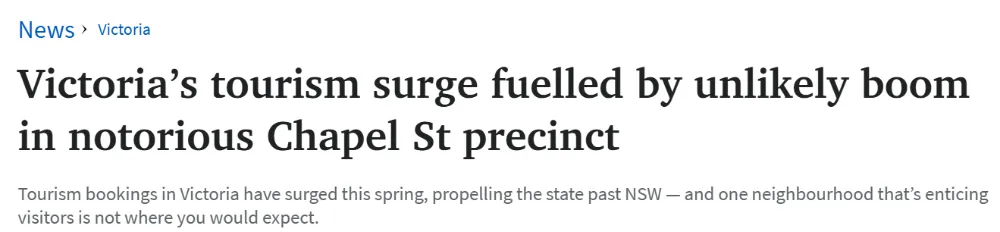 但就是这样一条“口碑两极”的街道,却突然间成了游客打卡热地,且这种趋势早在冬季报告中已有端倪——当时Stonnington区的旅游预订增长率就已达27.6%。