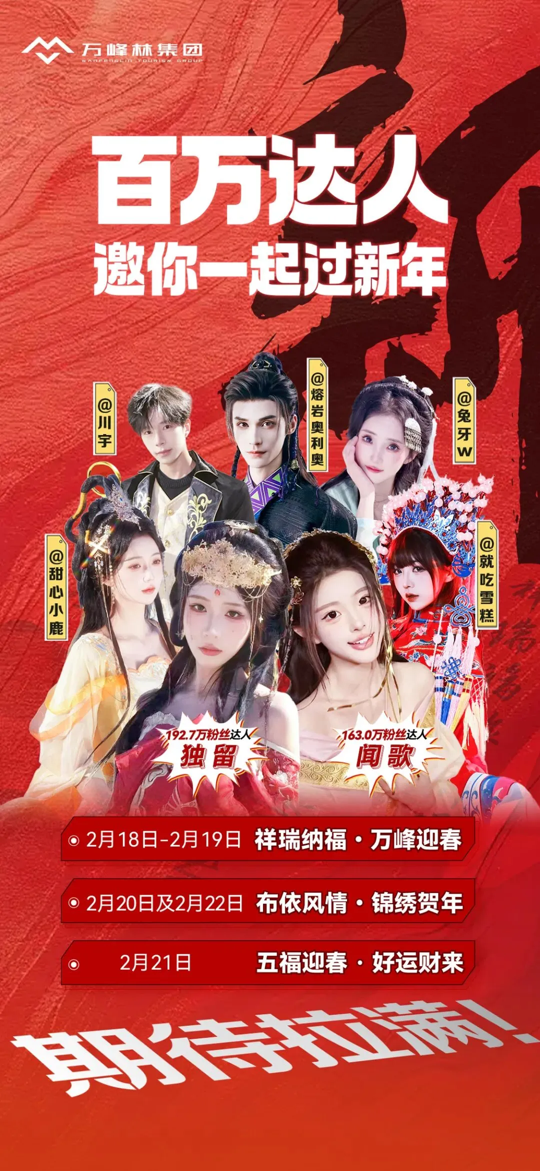 活动内容:每日邀请6位百万粉丝KOL,打造三大主题妆造,开展打卡合影、迎春贴福、民族舞蹈教学等互动。