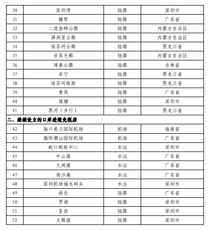 二、继续在海口美兰国际机场、蛇口邮轮中心等11个口岸设立口岸进境免税店(在本通知所附《设立口岸进境免税店名单》中为序号42—52)。