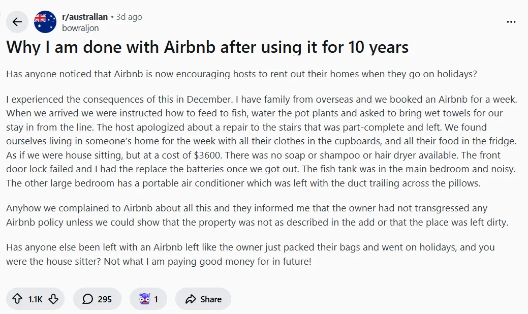 https://www.reddit.com/r/australian/comments/1qz617d/why_i_am_done_with_airbnb_after_using_it_for_10/