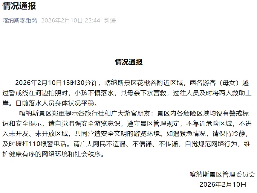 2月10日,新疆喀纳斯景区管理委员会发布情况通报,当日13时30分许,喀纳斯景区花楸谷附近区域,两名游客(母女)越过警戒线在河边拍照时,小孩不慎落水,其母亲下水营救,过往人员及时将两人救助上岸。目前落水人员身体状况平稳。