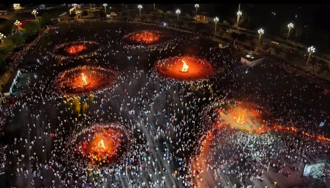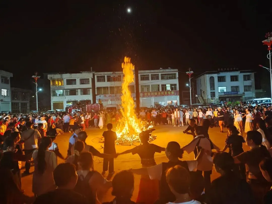 傍晚,火把巡游、祭火大典、篝火狂欢精彩纷呈,避暑游客和当地群众热烈狂欢,一片欢天喜地的热闹场面。