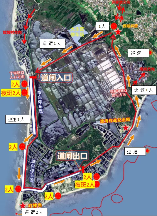(2)道路上:大本营停车场路段、丁字路口单向停车区、苞萝湾(渡海作战纪念园段、盐场段)