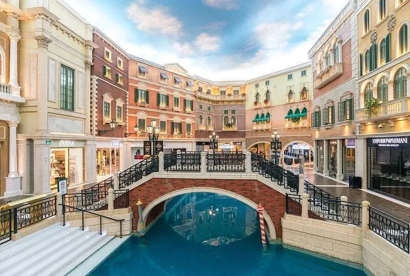 步入大堂,挑高的穹顶绘满精致的欧式油画,光洁的大理石地面倒映着水晶吊灯的光芒,空气中飘着淡淡的香氛。穿过奢华的接待区,便踏入了大运河购物中心的核心——这里没有风雨,只有永恒的晴空。巨大的人造天幕模拟着日出日落的光影,蓝天白云缓缓流转,让人恍惚间忘了此刻身处室内。三条蜿蜒的运河静静流淌,河水清澈见底,两岸是红白相间的欧式楼宇,拱形窗、石板路、雕花栏杆,复刻着威尼斯的经典风貌。
