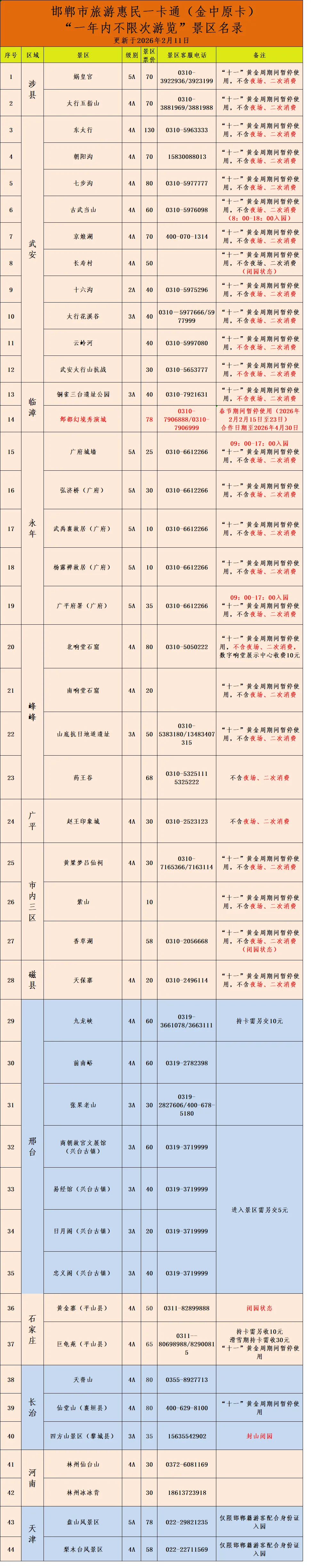【最新最全】“邯郸旅游年票”免费不限次景区名录(更新于2026年2月11日)