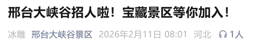 新年新气象,新年新风貌!邢台大峡谷景区邢台大峡谷长期以来,得到了邢台人民的鼎力支持和喜爱!多年来在方圆300公里范围内也有了一定的影响力!查看河北各地最新招聘信息