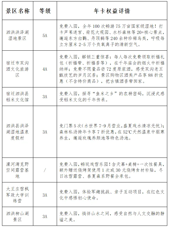 当洪泽湖的芦苇荡荡起清风,当双沟的酒香漫过古镇,当温泉的暖意包裹身心——泗洪,这座“湿地之都 水韵泗洪”的宝藏城市,正以一张数字旅游年卡,邀你解锁全年不限次的生态盛宴与人文狂欢。涵盖泗洪全县5A景区1个、4A景区1个、3A 景区4个,新业态景区1个,共计7大核心景区,全家四人共享的超值权益,让每一次出行都成为性价比之选。