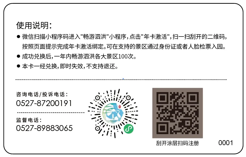 刮开实体卡背面二维码涂层,微信搜索“畅游泗洪”小程序;
