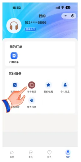 点击右下角“我的”,选择“年卡激活”,输入手机号码完成注册;