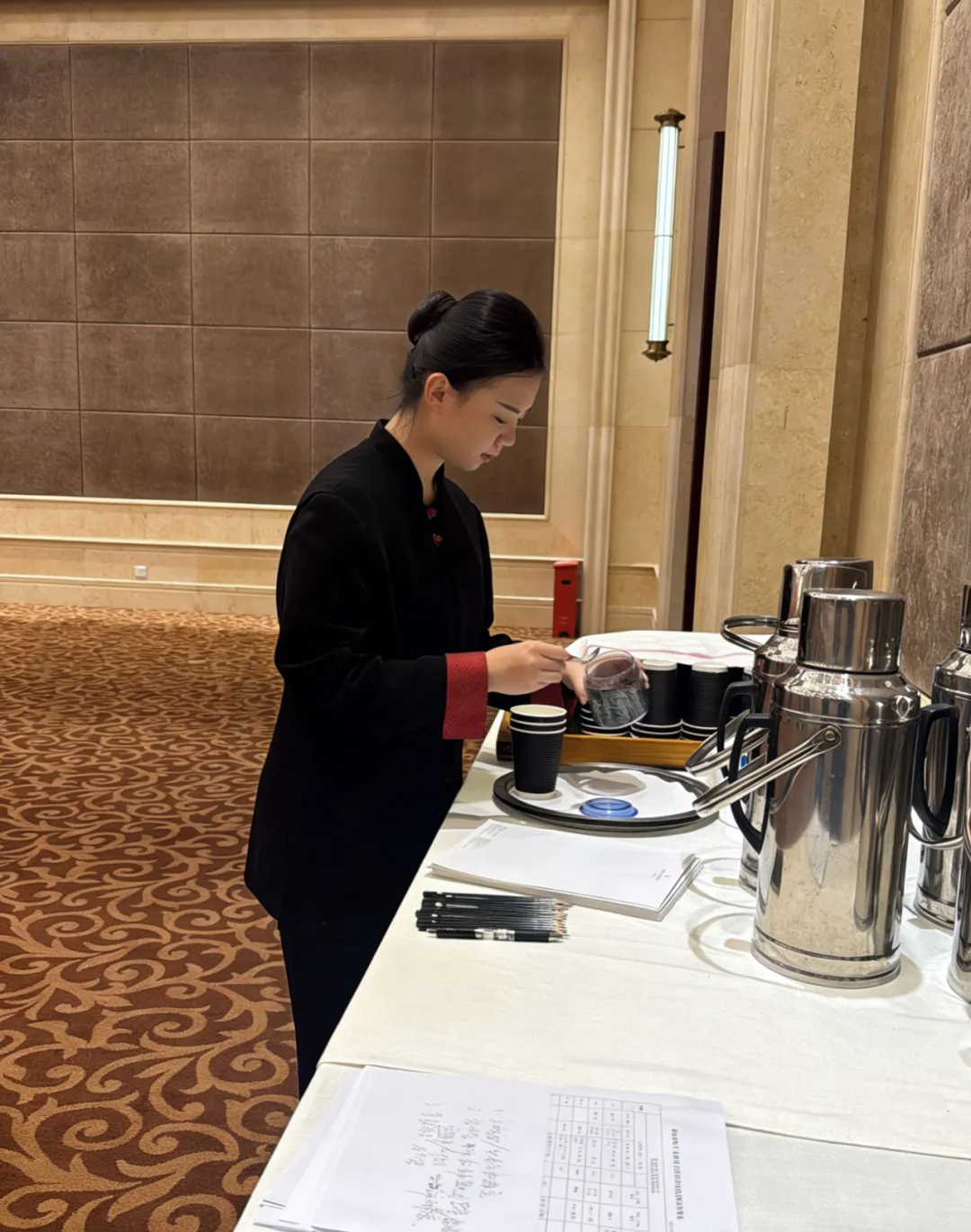 在实践期间,我们的工作严谨且细致。从桌椅台泥的摆放、茶具消毒,到对客的服务态度,每一步都有严格标准。两会接待规格高、要求严,我们时刻牢记“三轻”准则,说话轻、走路轻、操作轻,主动关注客人需求,把控服务节奏,确保会议有序进行。