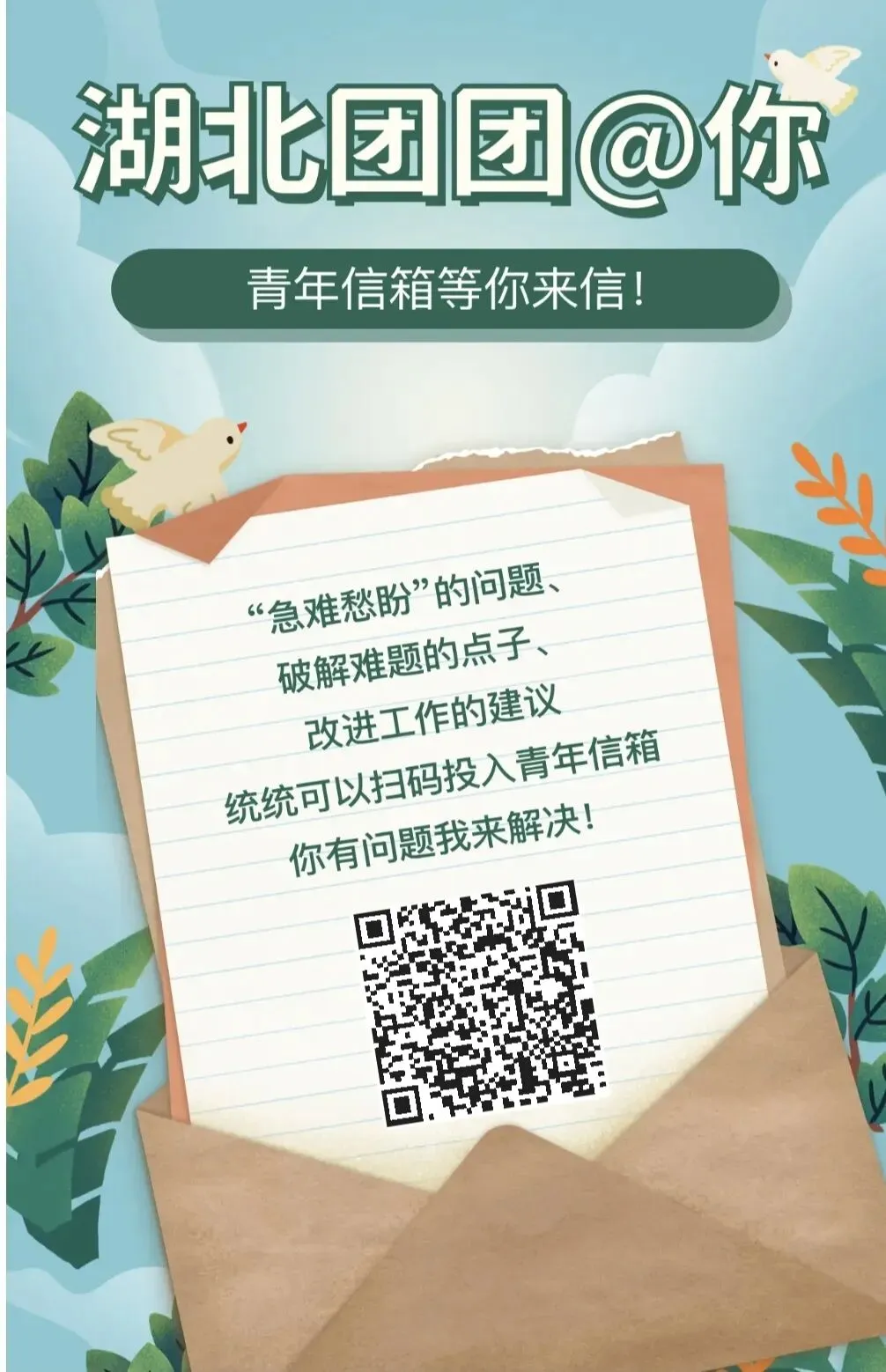 结合湖北共青团下基层察民情解民忧暖民心实践活动和“三联五助”行动,“青春湖北”特别开设了“青年信箱”专区,征集青年建议、倾听青年声音、回应青年诉求、帮助解决青年“急难愁盼”问题。有什么问题、困难或者解决建议、方案,统统都可以投递到“青年信箱”。