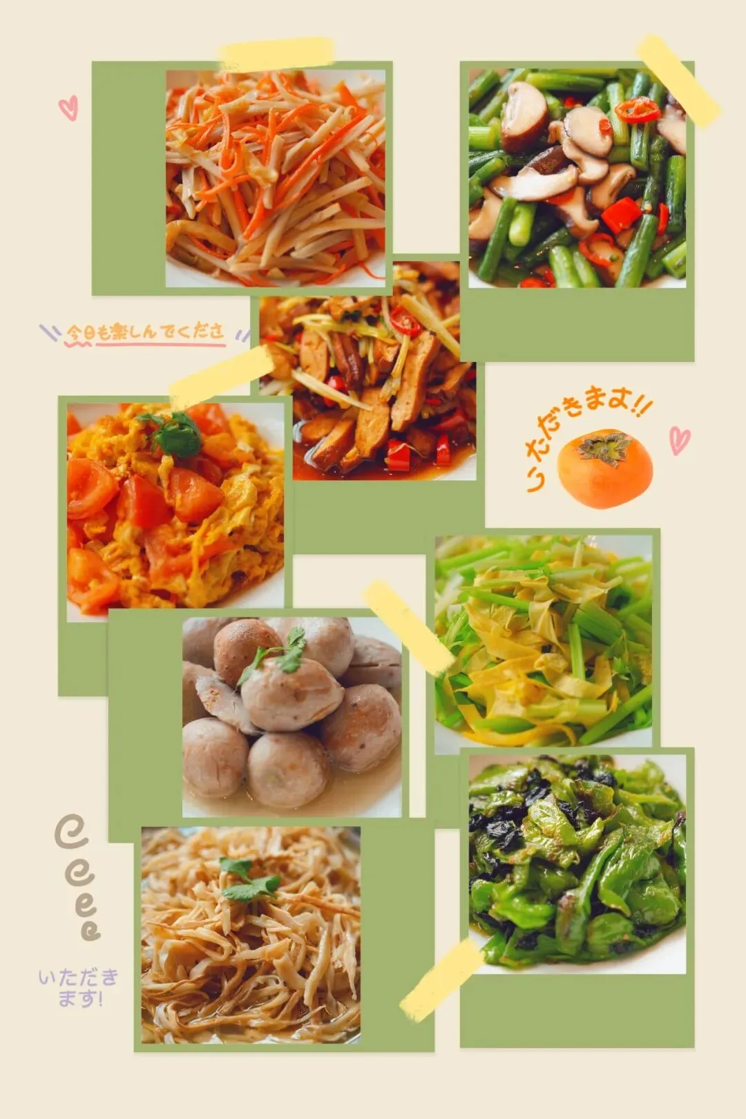 团团圆圆(红薯丸)、福寿双全(香菇焖萝卜)、福运绵长(炒三丝)、瑞雪丰年(酸辣椒炒扁萝卜)、金玉满堂(荞子炒香干)、步步高升(笋丝)、彩风迎春(荷包辣椒)、吉星高照(辣椒炒神岗魔芋)、荷塘月色(本地芹菜拌蛋皮)、年年有余(葱油芋子)、招财进宝(素鹅井)、福寿安康(山药木耳)、展翅高飞(椒盐菌菇)、兴欣向荣(辣椒炒莴笋干)、满堂鸿运(西红柿炒鸡蛋)、百财来福(有机青菜)