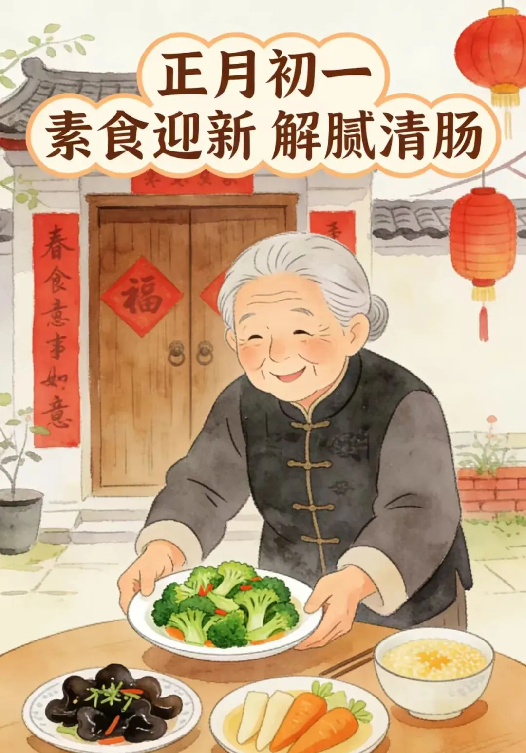 除夕的盛宴,是阖家团圆的高潮,是对旧岁的犒劳,杯盏交错间,满是热闹与欢喜。然而,大年初一的素食,恰如乐章后的温柔间奏,让欢腾后的脾胃得以舒缓,让喧闹中的心神慢慢沉淀。这体现了古人“饮食有节”的养生之道,也是“一张一弛”的古老生活哲学。在除夕的热闹之后,人们的身体和精神都处于一种较为亢奋的状态,而初一的素食则像是给身心做了一次温和的调整。